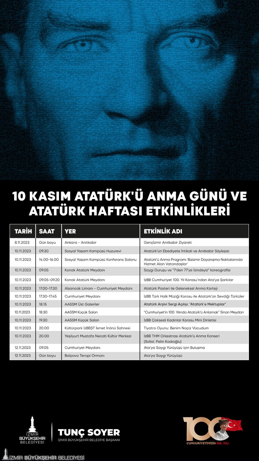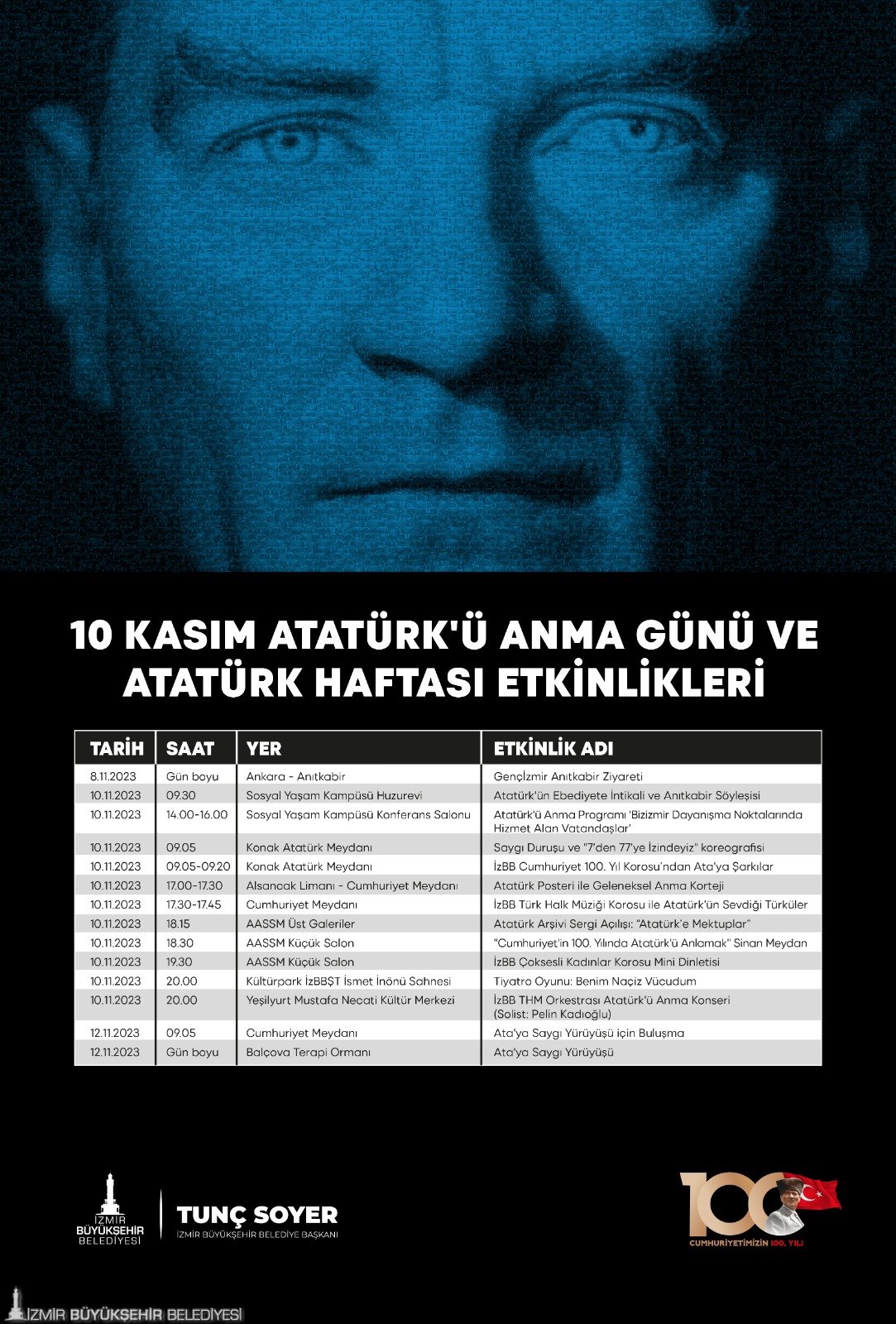 Saat 17.30 ile 17.45 arasında Cumhuriyet Meydanı’nda İzmir Büyükşehir Belediyesi Türk Halk Müziği Korosu ile Atatürk'ün Sevdiği Türküler hep bir ağızdan söylenecek. Saat 18.15’te Ahmed Adnan Saygun Sanat Merkezi’nde (AASSM) “Senin Atatürk’ün” sergisi ile 2022 yılından bu yana İzmirlilerin Atatürk’e yazdıkları mektuplar sergilenecek.