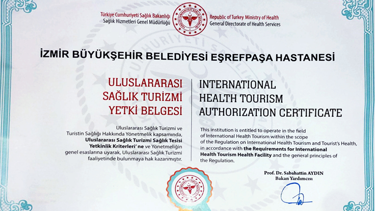İzmir Büyükşehir Belediyesi Eşrefpaşa Hastanesi, Sağlık Bakanlığı’nın kriterlere sahip sağlık kuruluşlarının alabildiği Uluslararası Sağlık Turizmi Yetki Belgesi’ni edinmeye hak kazandı. Eşrefpaşa Hastanesi, bu belge sayesinde yurt dışından da hasta kabul edebilecek. Yurtdışından gelen hastalar hastanenin tüm birimlerinden Sağlık Bakanlığı’nın belirlediği tedavi ücretleri üzerinden yararlanabilecek. Eşrefpaşa Hastanesi’nin internet sitesinde “Medikal Turizm” başlığı altında İngilizce bir bölüm de açıldı.