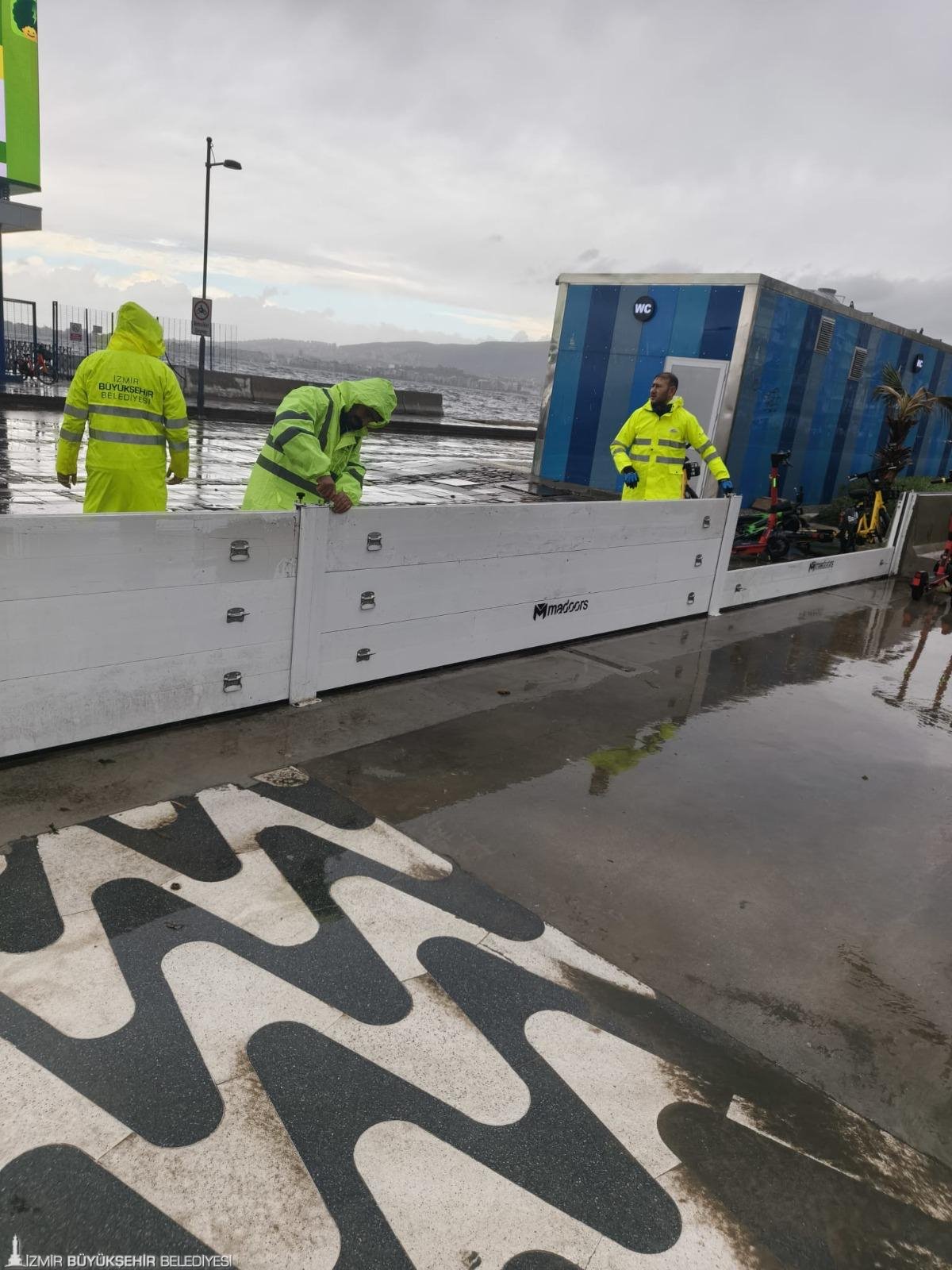 İzmir Büyükşehir Belediyesi’nin Kordon’da deniz taşkınlarını önlemek ve İzmirlilerin kıyı şeridini daha konforlu kullanmasını sağlamak amacıyla hayata geçirdiği geçici fırtına duvarı, kenti etkisi altına alan sağanak yağış ve fırtına sırasında deniz taşkınını engelledi. İzmir Büyükşehir Belediyesi Fen İşleri Dairesi Başkanlığı ekipleri, Meteoroloji Genel Müdürlüğü’nün uyarılarının ardından geçici fırtına duvarının kapılarını aktif hale getirerek olası risklere karşı önlem aldı.