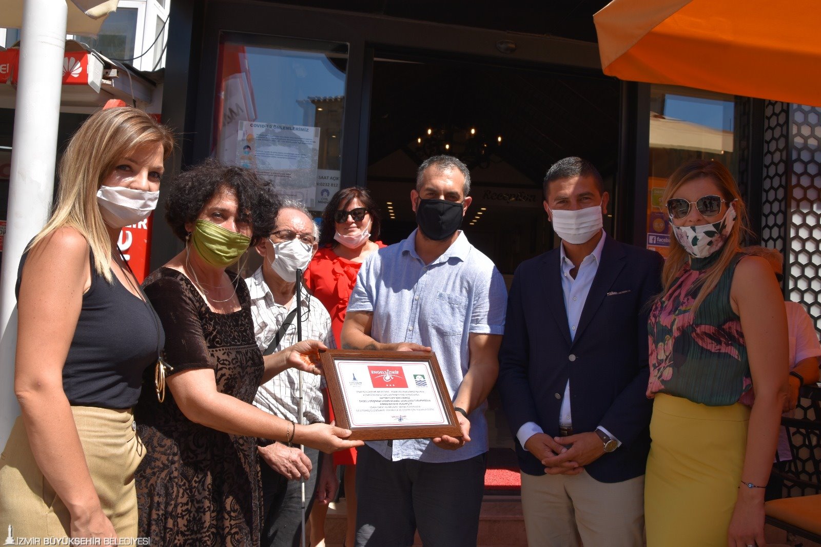 Neptün Soyer ve Fatih Gürbüz, Kırmızı Bayrak almaya hak kazanan Gatsby Cafe işletmecisi Taner Kaya’ya; İzmir’i daha yaşanabilir bir şehir yapmak için çalışan herkes adına teşekkür belgesi takdim etti.