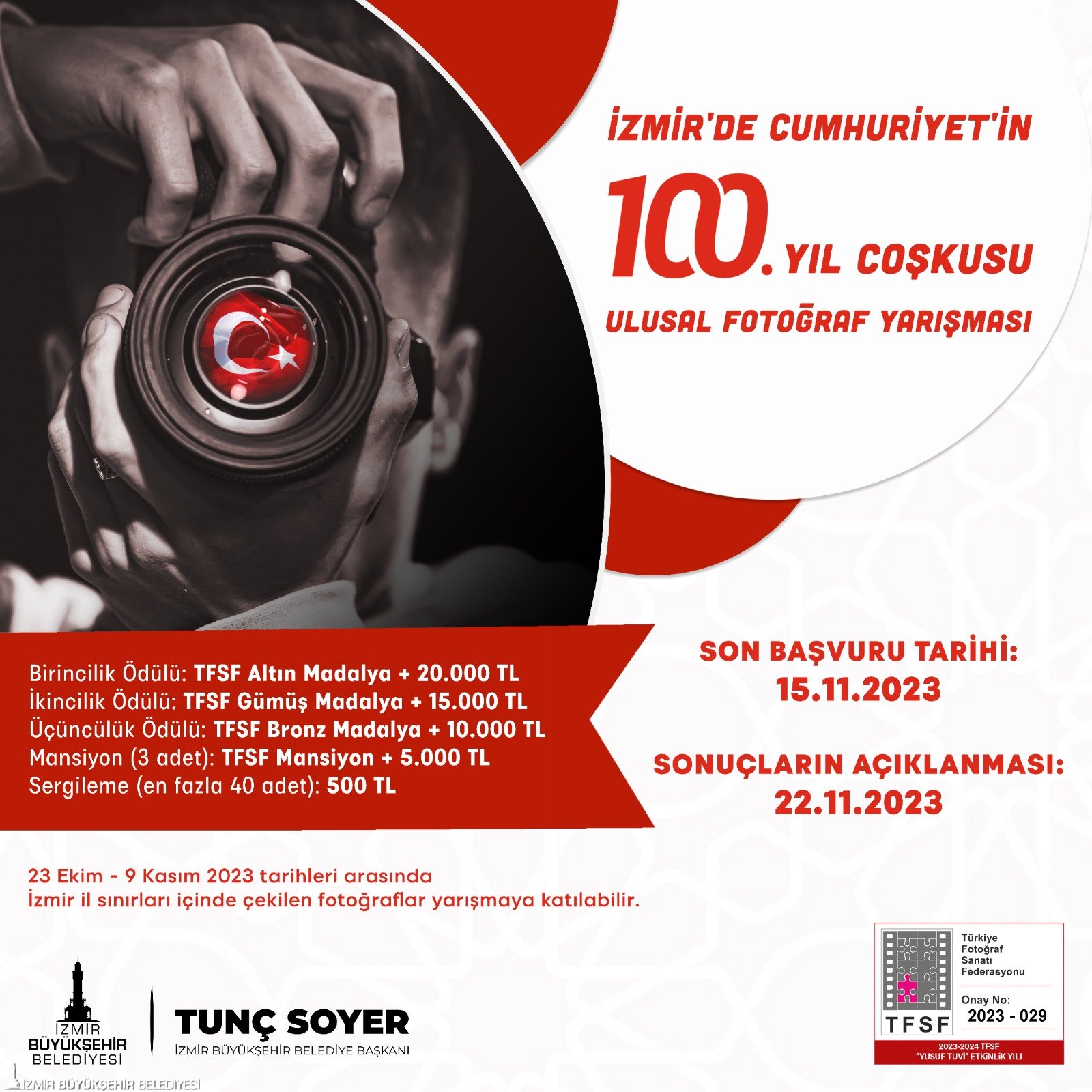İzmir Büyükşehir Belediyesi, Cumhuriyet’in 100’üncü yılı kutlamaları kapsamında “İzmir’de Cumhuriyet’in 100. Yıl Coşkusu” konulu Ulusal Fotoğraf Yarışması düzenliyor. İzmir Büyükşehir Belediyesi Kültür ve Sanat Dairesi Başkanlığı tarafından düzenlenen yarışmada, fotoğraf sanatı aracılığı ile Cumhuriyet’in 100’üncü yılı kapsamında yapılacak etkinlik ve kutlamaların belgelenmesi, amatör-profesyonel fotoğrafçıların İzmir’de buluşturulması, kentteki bu tarihi günlere ait görsel bellek oluşturulması amaçlanıyor. Yarışmada 23 Ekim - 9 Kasım 2023 tarihleri arasında çekilen fotoğraflar değerlendirmeye alınacak.