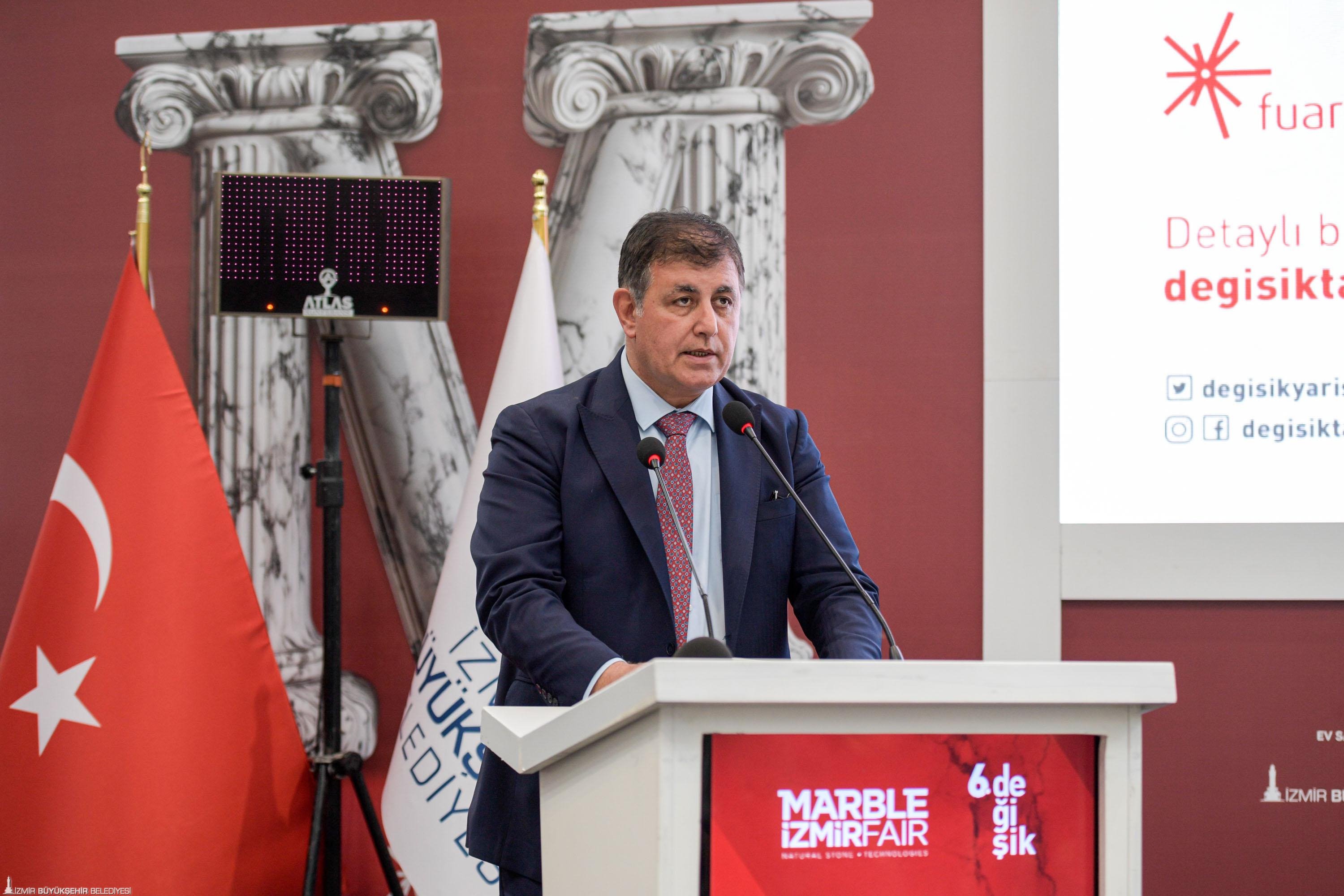 1995'te başlayan Marble İzmir Fuarı'nın doğal taş ihracatında Türkiye'ye büyük bir ivme kazandırdığını belirten İzmir Büyükşehir Belediye Başkanı Dr. Cemil Tugay, “Fuarımız sektörü, sektör de fuarımızı büyütmüştür. Nihayetinde Türkiye ve İzmir ekonomisi kazandı. Bu yıl ve önümüzdeki yıllarda da göreceksiniz ki bu karşılıklı ilişki ülkemize, İzmir'imize güç katmaya devam edecektir. Fuarımız bir yandan dünya doğal taş ve mermer sektörünün kalbinin attığı yer olurken, öte yandan tasarım ve mimari ile Türk doğal taşının değerinin artırılması ve yenilikçi yüzünün pazarlarda sergilenmesi misyonunu da üstlenmiştir. Tam da bu nedenle bugün 6. kez düzenlenen Uluslararası Değişik Doğaltaş Yarışması'nın ödül törenindeyiz. Bu yarışma ile murat etiğimiz; dünya markası fuarımız kapsamında bu toprakların en değerli taşlarını, en değerli insan kaynağımız genç tasarımcılarımız eliyle dünyaya daha fazla duyurmak ve sektöre daha fazla katkı sağlamaktır. Her yıl yarışmamıza olan ilginin de arttığını görmek gurur vericidir. Ödül alan yarışmacılarımızı yürekten kutluyorum” diye konuştu.