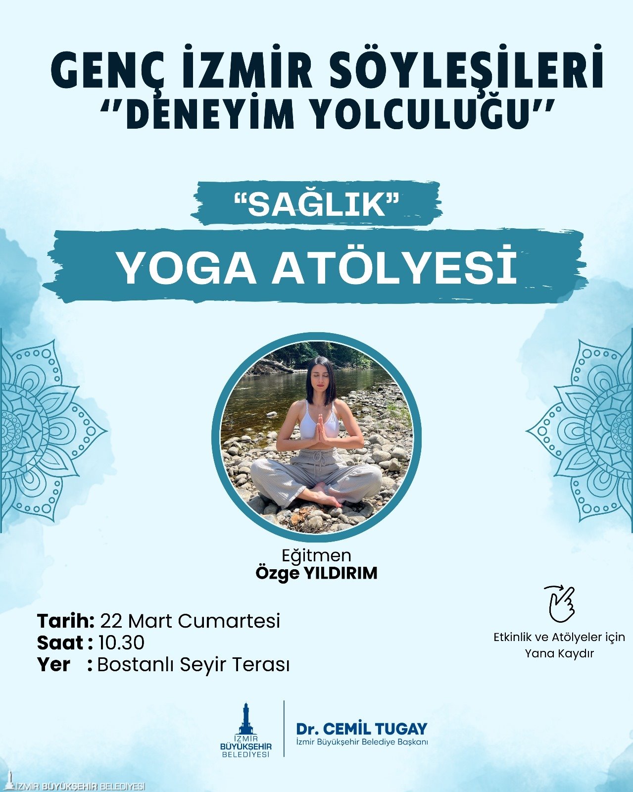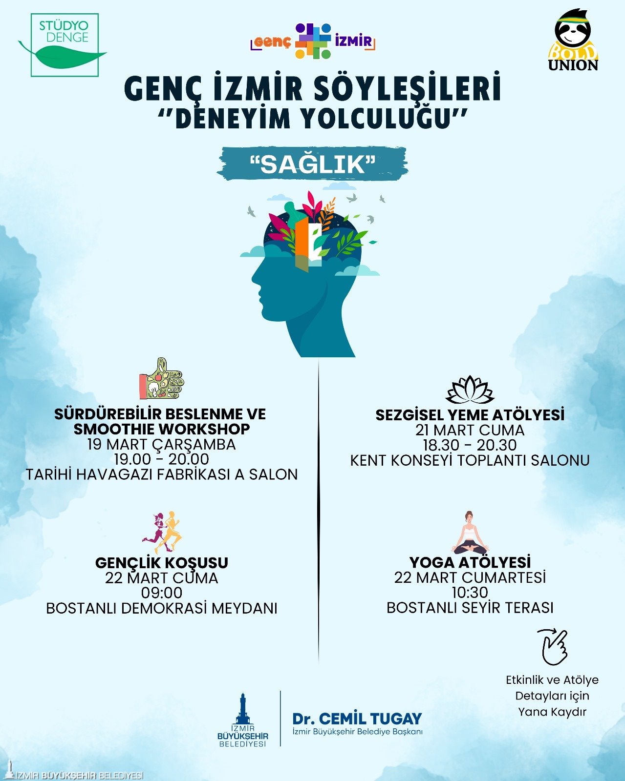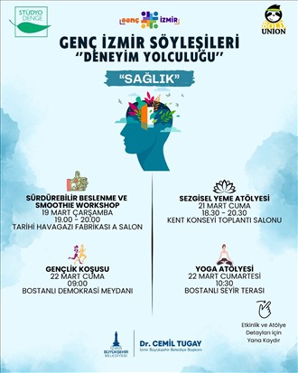 Kentin her noktasında hayata geçirilen projelerle gençlerin fırsat eşitliği çerçevesinde çalışmalar yürüten İzmir Büyükşehir Belediyesi, Genç İzmir Söyleşileri Deneyim Yolculuğu programını mart ayında da sürdürüyor. Bu kapsamda düzenlenecek Gençlik Koşusu, workshop ve etkinliklerin teması “Sağlık” olarak belirlendi. Gençlik ve Spor Hizmetleri Dairesi Başkanlığı bünyesinde çalışan Gençlik Çalışmaları Şube Müdürlüğü'nün organize ettiği etkinlikler 19-21 ve 22 Mart tarihlerinde ücretsiz gerçekleştirilecek.