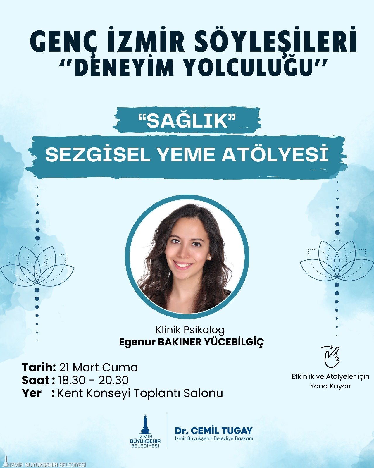 Genç İzmir Söyleşileri Deneyim Yolculuğu kapsamında 19 Mart Çarşamba günü saat 19.00’da “Sürdürülebilir Beslenme ve Smoothie” workshop’u, Diyetisyen İrem Tekin tarafından Tarihi Havagazı Fabrikası A Salon’da yapılacak. 21 Mart Cuma günü saat 18.30’da “Sezgisel Yeme Atölyesi” ise Klinik Psikolog Egenur Bakıner Yücebilgiç tarafından Kent Konseyi Salonu’nda gerçekleştirilecek. 22 Mart Cumartesi günü saat 09.00’da Gençlik Koşusu yapılacak. Bold Union iş birliği ile düzenlenecek koşu, Bostanlı Demokrasi Meydanı’ndan başlayıp Bostanlı Sahili boyunca devam edecek. Katılımcılar toplam 4 kilometre koşacak. 22 Mart Cumartesi saat 10.30’da da Yoga Atölyesi, Eğitmen Özge Yıldırım tarafından Bostanlı Seyir Terası’nda yapılacak. Ücretsiz olan etkinliklerde başvuru için www.gencizmir.com adresi ziyaret edilebiliyor.