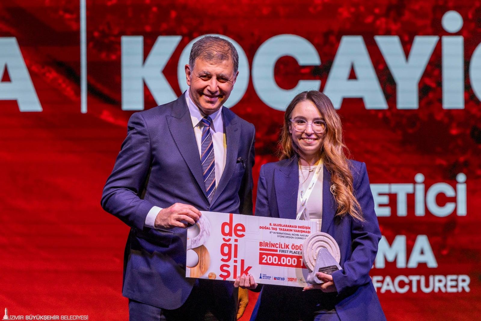 200 bin liralık birincilik ödülünü “Litik Lumina” adlı eseriyle Hümeyra Kocayiğit kazandı. Kocayiğit’e ödülünü Başkan Tugay takdim etti. 130 bin liralık ikincilik ödülünü “Strata” adlı eseriyle Ulviye Akgül, Büşra Nur Kılınçarslan ve Arda Deniz Yücel kazandı. Gençler ödüllerini Türkiye Mermer Doğaltaş ve Makinaları Üreticileri Birliği Başkanı Hanifi Şimşek’ten aldı. 65 bin liralık üçüncülük ödülünü ise “Hextone” adlı eseriyle Tuğba Koşak kazandı. Koşak’a ödülünü İZFAŞ Genel Müdürü Tuğçe Cumalıoğlu takdim etti. Ege Maden İhracatçıları Birliği Özel Ödülü’nü Arda Uluç Aydın, Erdoğan Akbulak Özel Ödülü’nü Defne Turan ve firma ödüllerini ise Hilal Akyüz, Oğuz Erten, Ece İldeniz, Yağmur Çelik, Berke Güntürk, Begüm Kübra Çetin, Beste Çetin, Begüm Sucu kazandı.