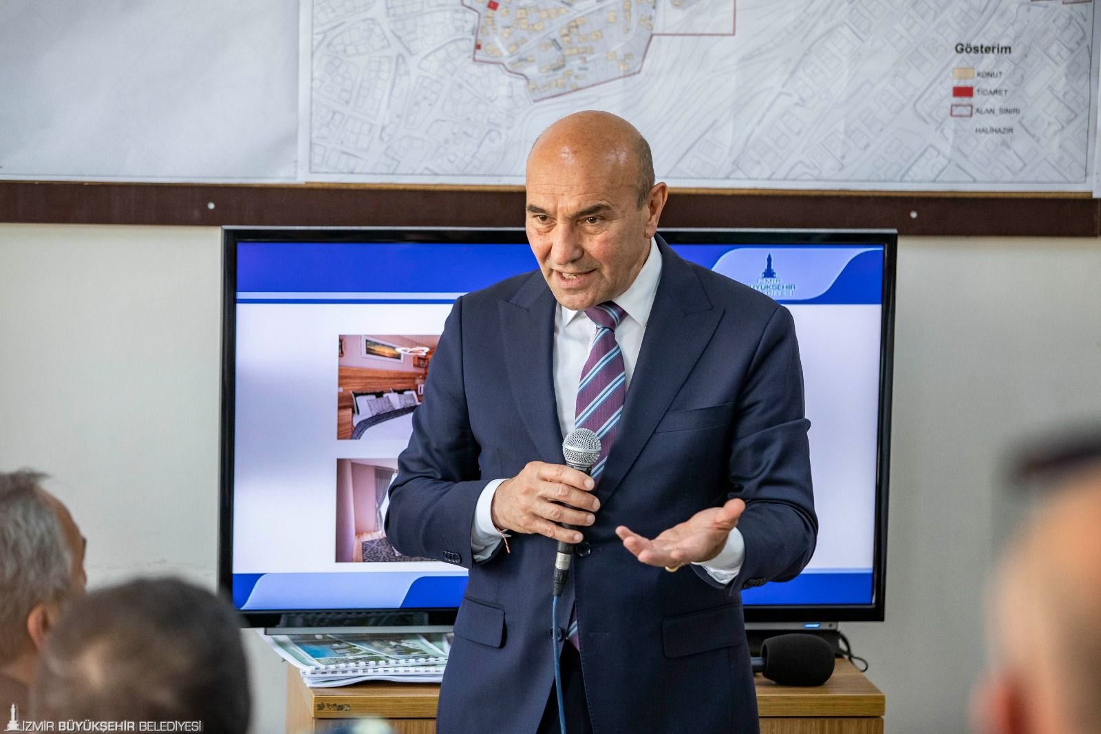 Başkan Soyer toplantıda “Burada gördüğünüz çalışmada özet itibariyle sizlerin önerileriyle, sizlerin talepleriyle ve sizin içinize sinsin diye bu değişiklikler yapıldı. Bir kere öncelikle binaların konumlandırılması değiştirildi. Eğime göre, vadinin konumuna göre ve manzaraya göre değişti. İkincisi, vaziyet planında bloklarda 7 daire vardı, bu sizlerden gelen talepler doğrultusunda 4’e indirildi ve metrekareler biraz daha büyütüldü. Ev içindeki mutfaklar da açık mutfak olmaktan çıktı. Kısacası yapılan tüm çalışmalar sizin istekleriniz doğrultusunda yeniden yapıldı” diye konuştu.