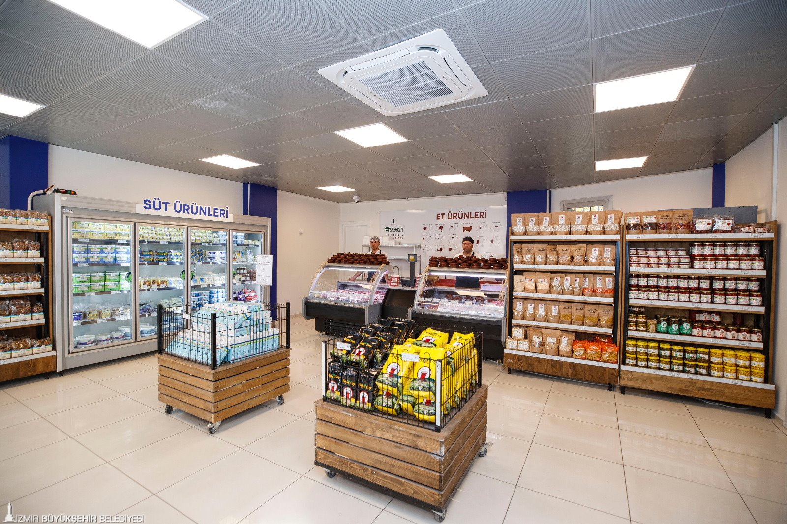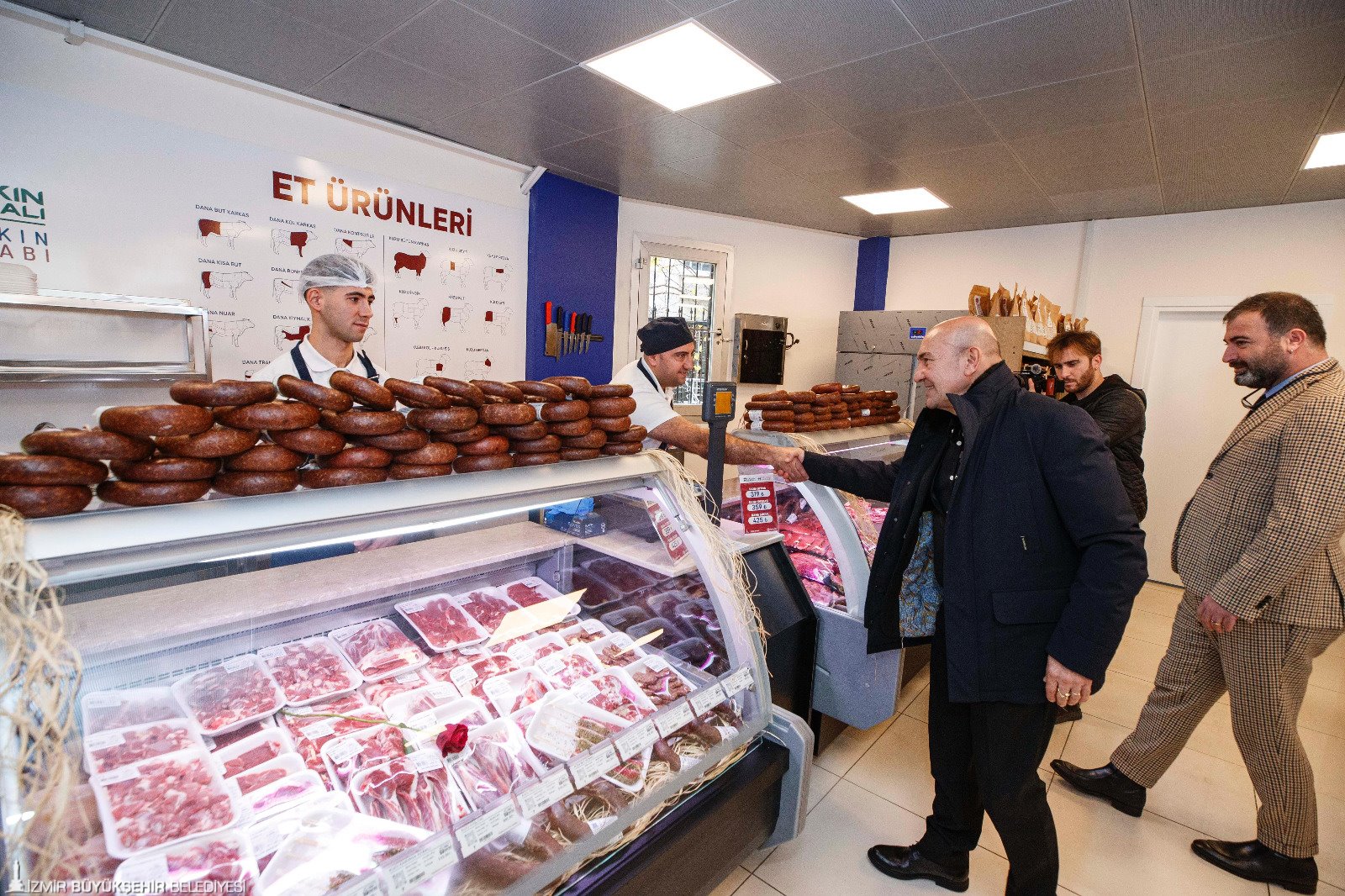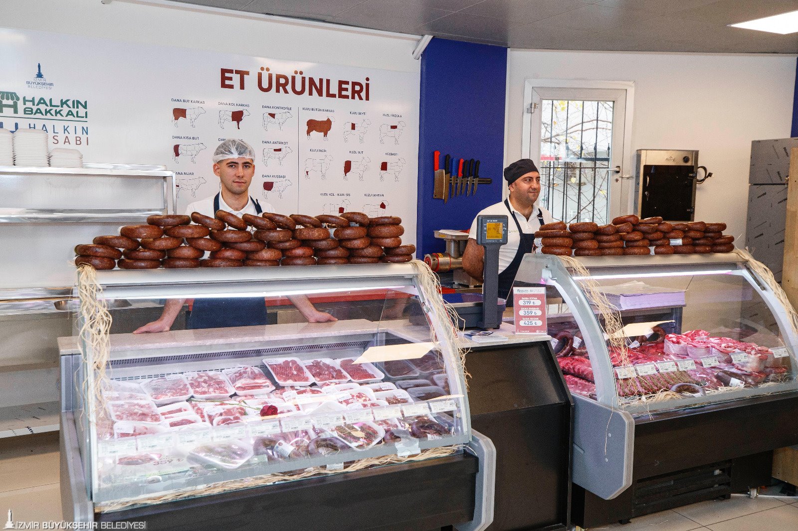 İzmir Büyükşehir Belediyesi’nin iştiraki İzTarım A.Ş. tarafından yürütülen çalışmalar kapsamında, tamamen yerli üreticiden alınan besiler, Ödemiş Et Entegre Tesisi’nde karkas et ve İzmirli markalı et ürünleri olarak işleniyor. Hazırlanan et ürünleri sayıları 13’e ulaşan Halkın Bakkalı/Halkın Kasabı mağazalarında uygun fiyatlarla tüketiciyle buluşturuluyor.