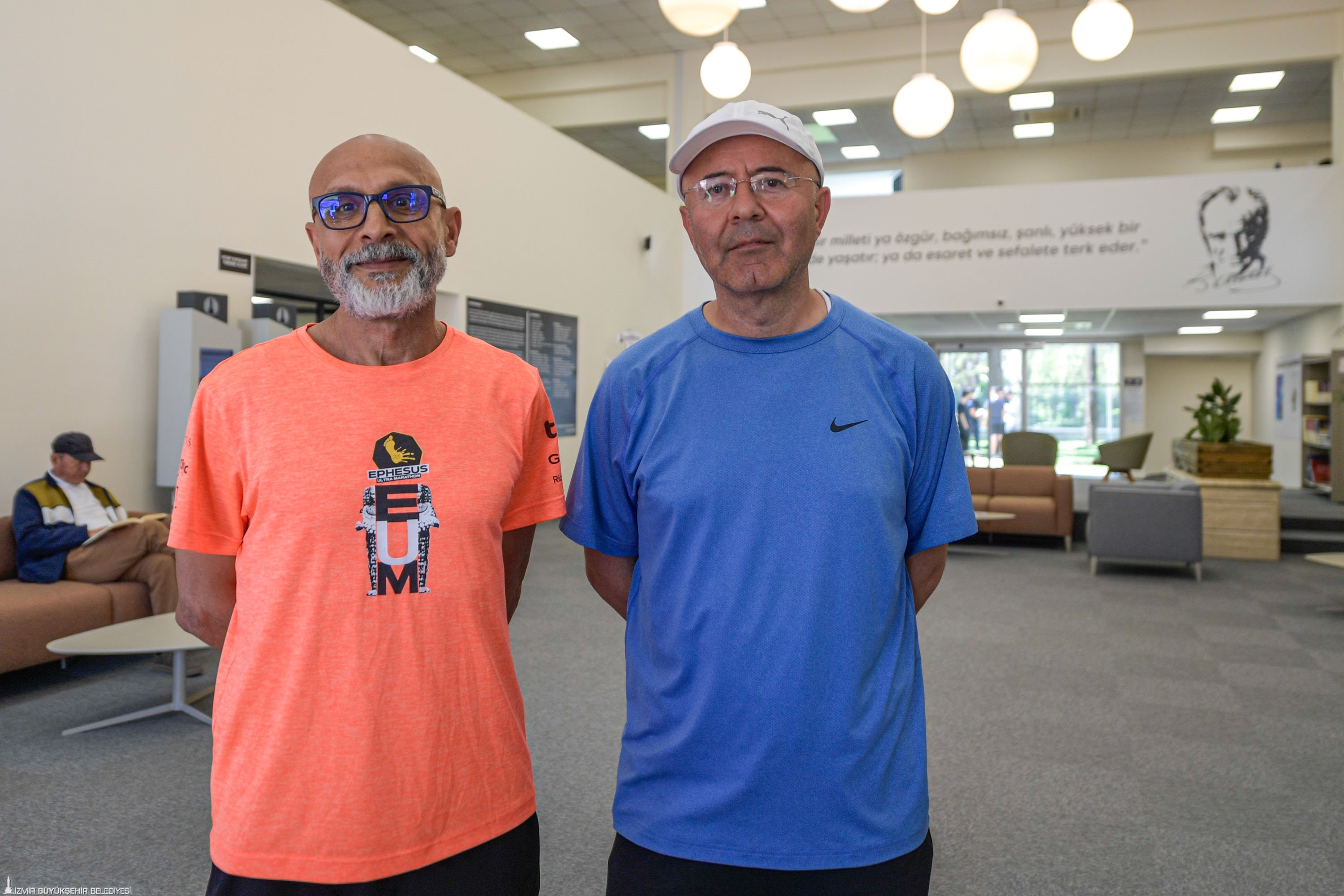 Kültürpark’ta koşu antrenmanı yapan Remzi Yıldırım ve Özgür Doğan, sporun ardından Hasan Ali Yücel Kütüphanesi’ni ziyaret ediyor. Remzi Yıldırım, Kültürpark’ı çok amaçlı kullandıklarını belirterek, “İzmir Büyükşehir Belediyesi’nin Kültürpark’ta Hasan Ali Yücel adını taşıyan bir kütüphane yapması çok kıymetli. Okudukça umarım birbirimizi anlayabilmenin bir yolunu bulabiliriz” dedi. Özgür Doğan da “Kültürpark’ta düzenli olarak antrenman yapıyoruz. Önce İlber Ortaylı Kütüphanesi’ne uğruyoruz ardından Hasan Ali Yücel Kütüphanesi’ne geliyoruz. Harika bir yapı, mükemmel bir tesis. İzmir Büyükşehir Belediyesi’ne çok teşekkür ediyoruz. Bizim için bulunmaz bir nimet” diye konuştu.