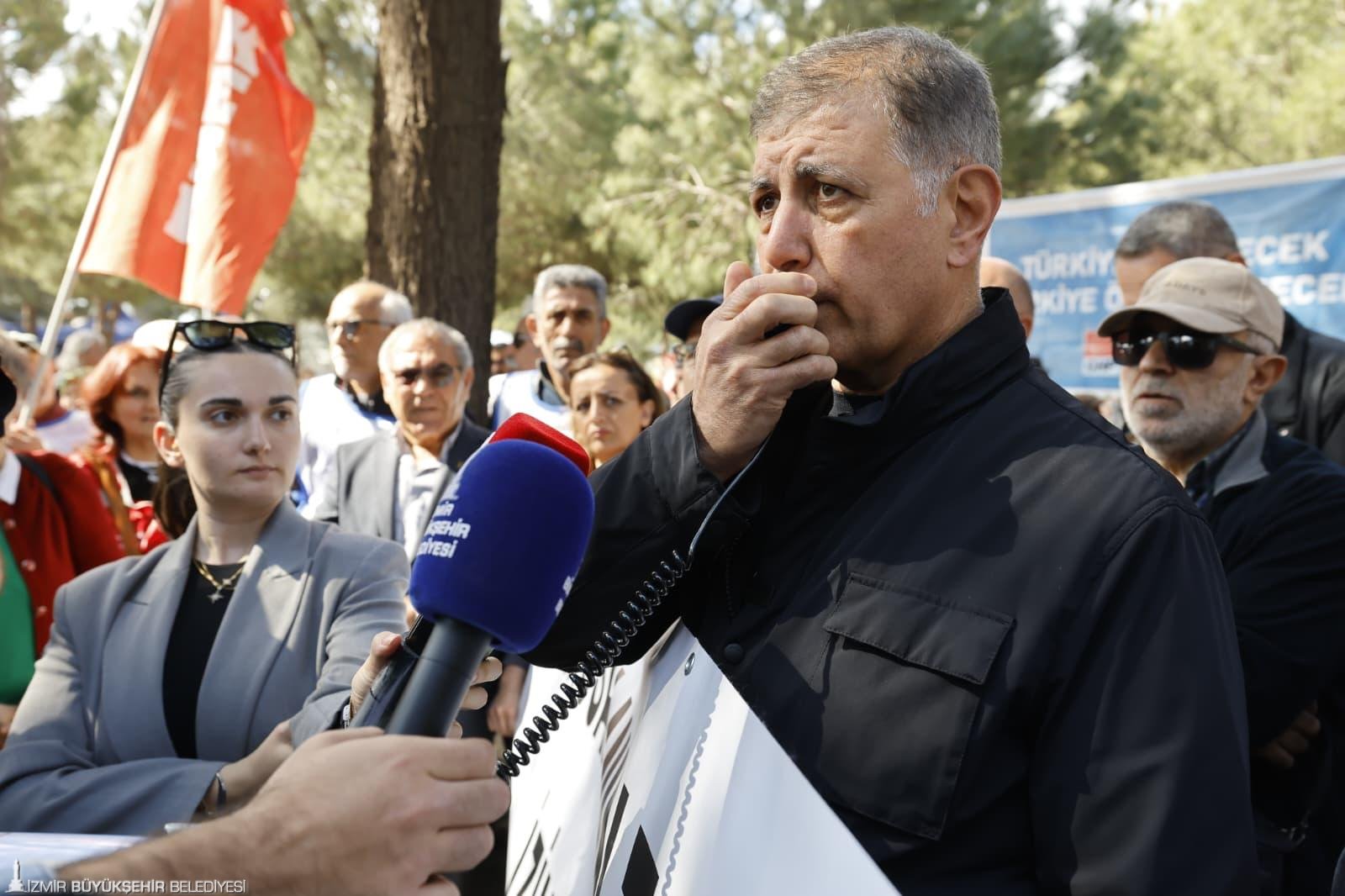 Başkan Tugay, “Bu yasaklarla, baskılarla, inatlaşarak nereye kadar gidecekler. Kötülüğün normalleşmemesi lazım. Bu zulüm kabul edilemez. İtirazımız devam edecek. Buraya gelemeyen insanlar bulunduğu yerden tepkililer. Bu halk bu kötü yönetime her yerde dur demeli. Bunun için seçimi beklemeyelim. Hattı müdafaa yoktur, sathı müdafaa vardır. O satıh önce bütün İzmir daha sonra bütün Türkiye’dir. Haksızlıkları kabul etmiyorum. Bu yanlışı kimsenin kabul etmesini doğru bulmuyorum. Kimse boyun eğmek zorunda değil. Kötülük normalleşmesin, kötülük bitsin” ifadelerini kullandı.