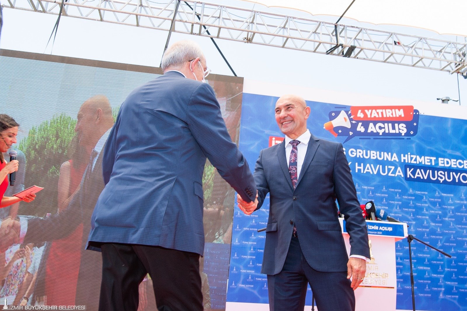 İzmir Büyükşehir Belediyesi’nin toplam değeri 1 milyar lirayı aşan 4 yatırımının açılış töreni için kente gelen CHP Genel Başkanı Kılıçdaroğlu’nun ikinci durağı Bornova’daki Havuz İzmir oldu. Aşık Veysel Rekreasyon Alanı içerisinde 16 milyon lira maliyetle inşa edilen tesisin açılış töreninde İzmir Büyükşehir Belediye Başkanı Tunç Soyer, “Su sporlarını teşvik etmek ve spor takımlarını desteklemek için İzmir’e kazandırdığımız Havuz İzmir, aslında pandeminin yaşamımızda ne tür olumsuzluklar yarattığını da hatırlattı. 2020 yılında planladığımız takvim dâhilinde yapımını tamamladığımız halde kısıtlamalar nedeniyle hizmete açamamıştık. İlk kez bugün hizmete sunuyoruz. Pandemi süreci belki yatırımlarımızı durduramadı ama bugünkü gibi kıymetli buluşmaları geciktirdi” dedi.