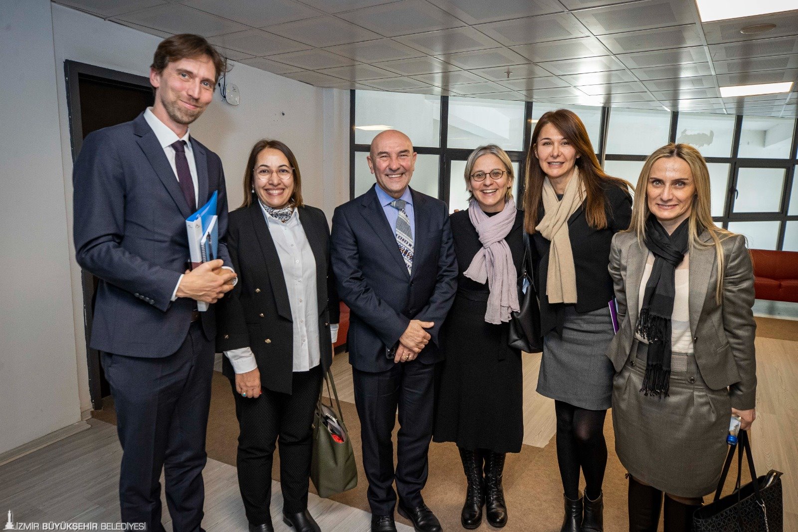 Avrupa Birliği Türkiye Delegasyonu ve üye ülkelerin elçi müsteşarlarının oluşturduğu heyet, İzmir Büyükşehir Belediye Başkanı Tunç Soyer’i Fuar İzmir’de ziyaret etti. AB Türkiye Delegasyonu Başkan Yardımcısı Elçi Müsteşar Eleftheria Pertzinidou önderliğindeki heyetin ziyaretinde İzmir Büyükşehir Belediyesi Dış İlişkilerden Sorumlu Başkan Danışmanı Onur Eryüce, İzmir Büyükşehir Belediyesi Dış İlişkiler ve Turizm Dairesi Başkanı Gökçe Başkaya, İZFAŞ Genel Müdürü Canan Karaosmanoğlu Alıcı da yer aldı.