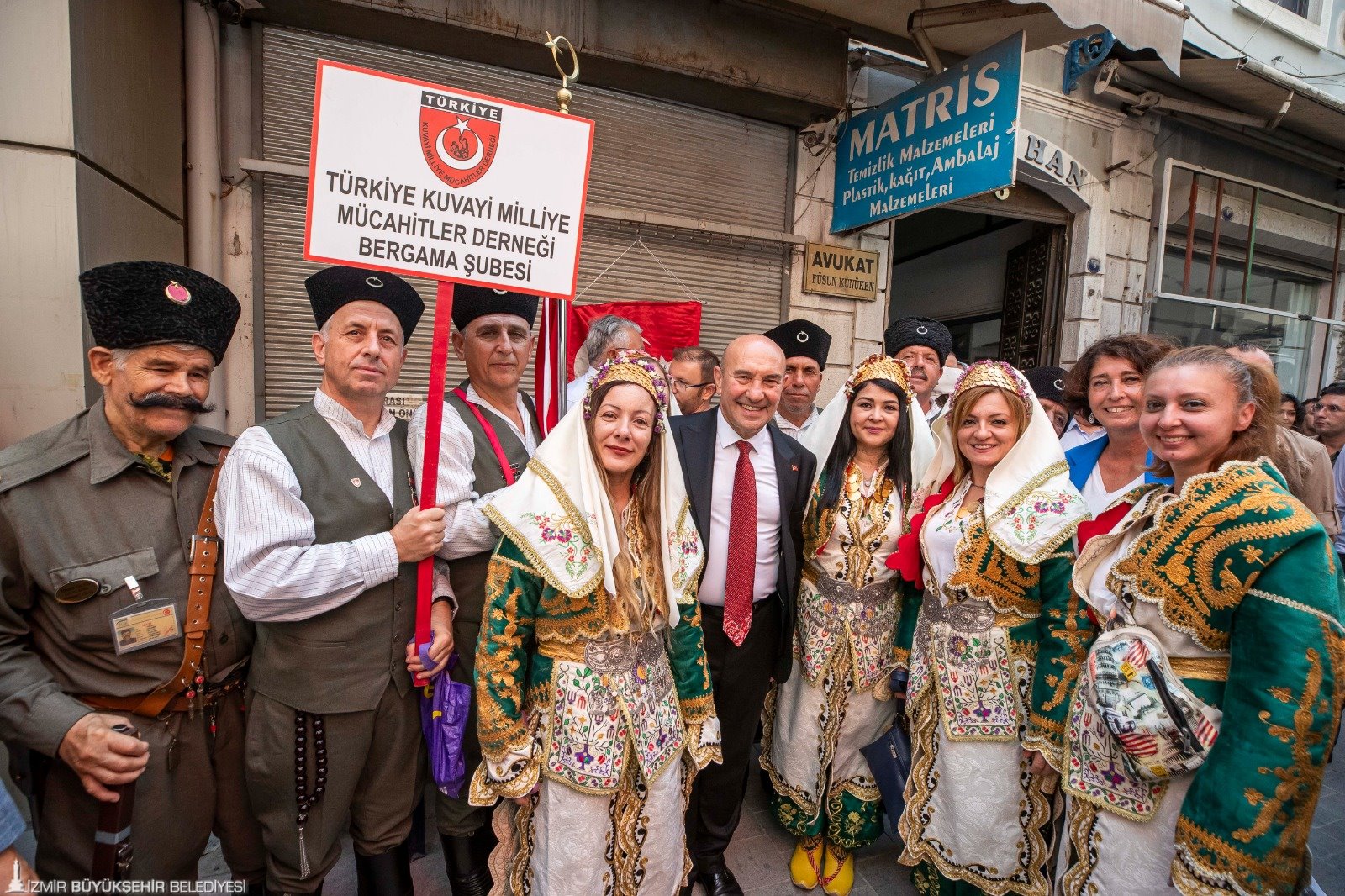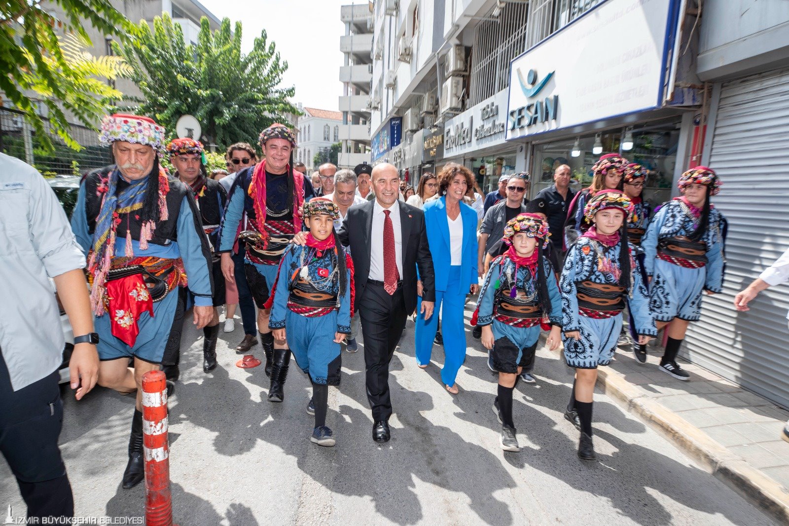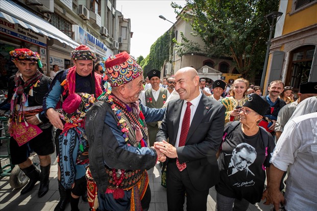 Başkan Tunç Soyer’e eşi Neptün Soyer, Konak Belediye Başkanı Abdül Batur, Hür Efe Gazetesi imtiyaz sahibi, Şeref Üsküp’ün oğlu Cem Üsküp ve ailesi, sivil toplum kuruluşları başkan ve temsilcileri, meclis üyeleri, muhtarlar, efe ve zeybekler eşlik etti.