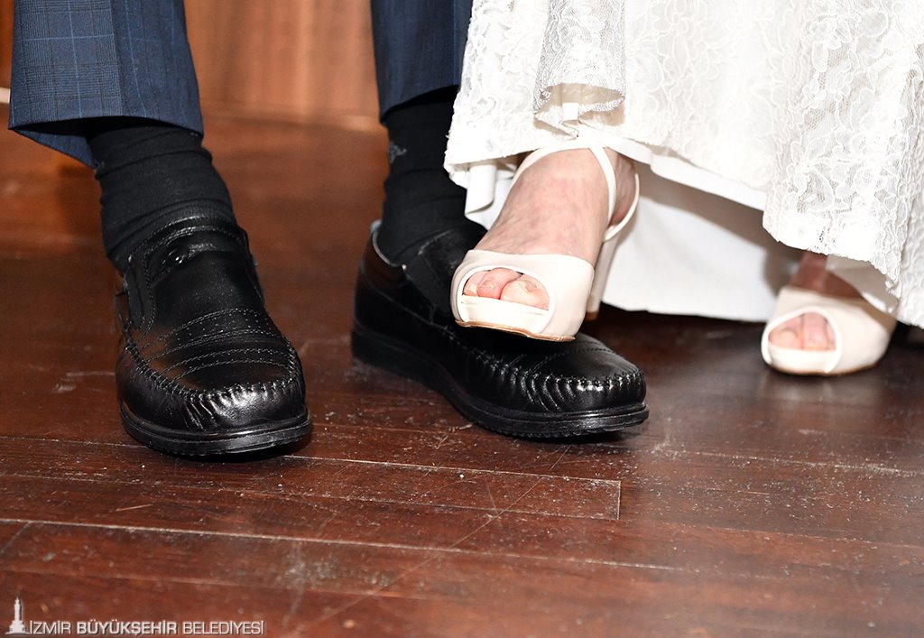 Huzurevi'nin balo salonunda kıyılan nikahın şahitliğini İzmir Büyükşehir Belediyesi Genel Sekreter Yardımcısı Aysel Özkan ile Etüt ve Projeler Dairesi Başkanı Hülya Arkon yaptı. 6 ay boyunca Hasibe Önder’i evliliğe ikna etmek için peşinden koşturduğunu söyleyen Nazmi Andaç, nikahı kıyılırken göz yaşlarını tutamadı. Gelin daha sonra bir nikah geleneğini yerine getirerek damadın ayağına bastı. Özdemir Erdoğan’ın “Bana Ellerini Ver” şarkısı eşliğinde ilk danslarını yapan çift, ardından düğün pastasını keserek birbirlerine ikram etti.