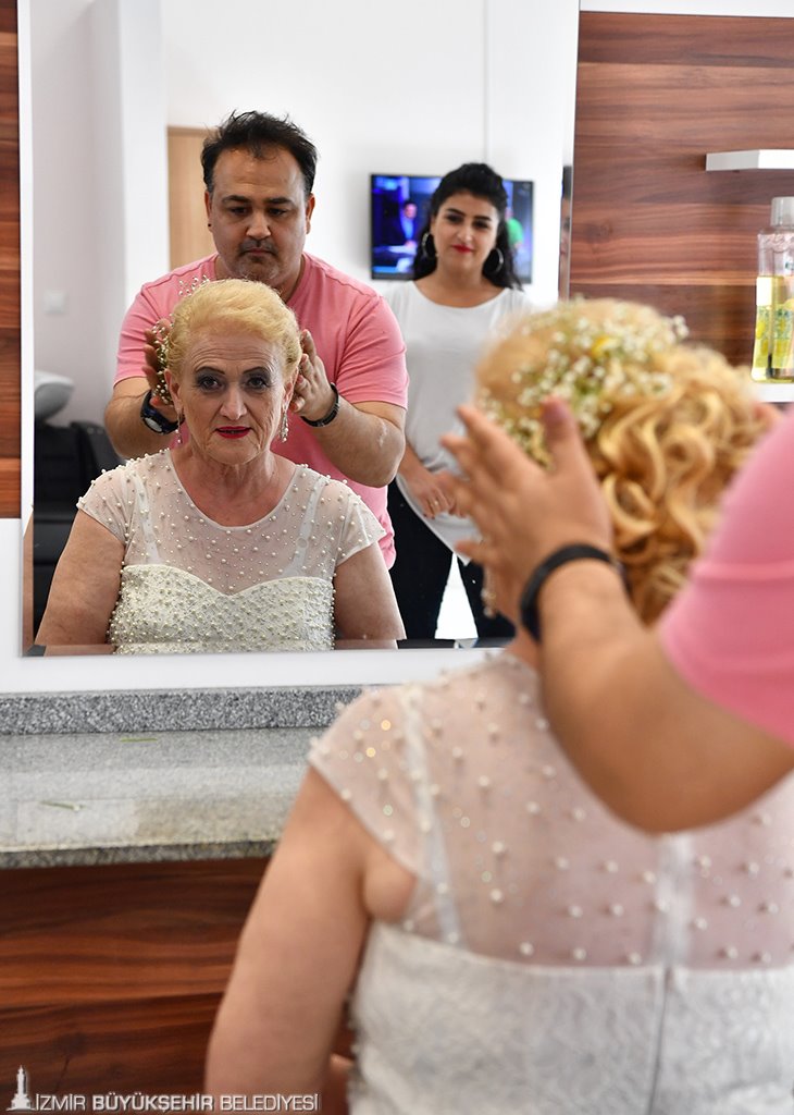 İzmir Büyükşehir Belediyesi Huzurevi’nde sabah saatlerinden itibaren tatlı bir telaş vardı. Gelin Hasibe Önder, Huzurevi’nde yer alan kuaförde saçlarını ve makyajını yaptırdı. Damat Nazmi Andaç ise damat tıraşı oldu. Gelin ile damat düğüne hazırlanırken, gelinin arkadaşları da en güzel kıyafetlerini giyip süslenerek nikaha hazırlandı. Bu arada gelinin ayakkabının altına isimlerini yazmak isteyen Huzurevi'nin genç kızları da sıraya girdi. Gelinin nikah çiçeğini kapmak isteyenler arasında ise kıyasıya bir mücadele vardı.