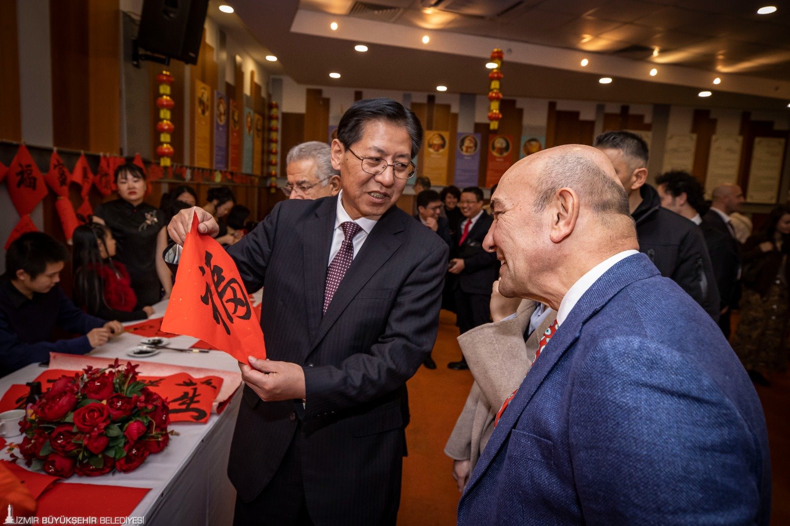 Çin’in Ankara Büyükelçisi Liu Shaobin ise Çin yeni yılının Çin için geleneksel bir bayram olduğunu belirterek “Her şey yepyeni olacak ve yeni başlangıçlar olacak demektir. Bu yıl Türkiye Cumhuriyeti’nin kuruluşunun 100’üncü yıldönümü. Her iki ülkenin kendi hayallerini gerçekleştirme yolunda birlikte hareket etmelerinin önemli olduğunu düşünüyorum. Türkiye’nin üçüncü büyük şehri olan İzmir, sanayi ve ticaret başta olmak üzere pek çok alanda Türkiye’nin ön sıralarında yer alıyor. İzmir Büyükşehir Belediyesi kardeş şehir ilişkileri kurarak önemli bir işbirliği hattı kurdu. Çin ve İzmir arasında pandemi sürecinde duran ilişkiler daha da canlanacak” diye konuştu.