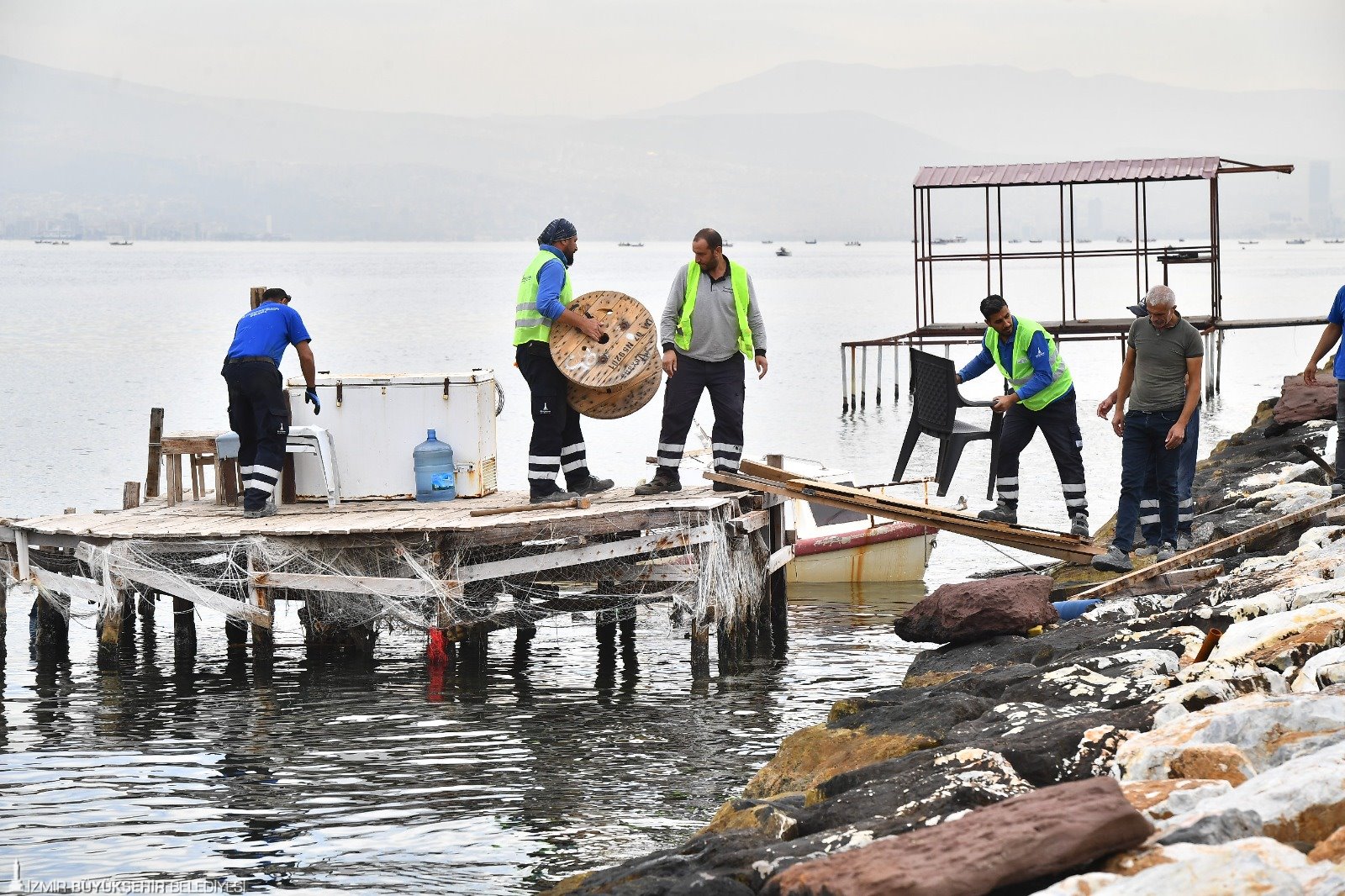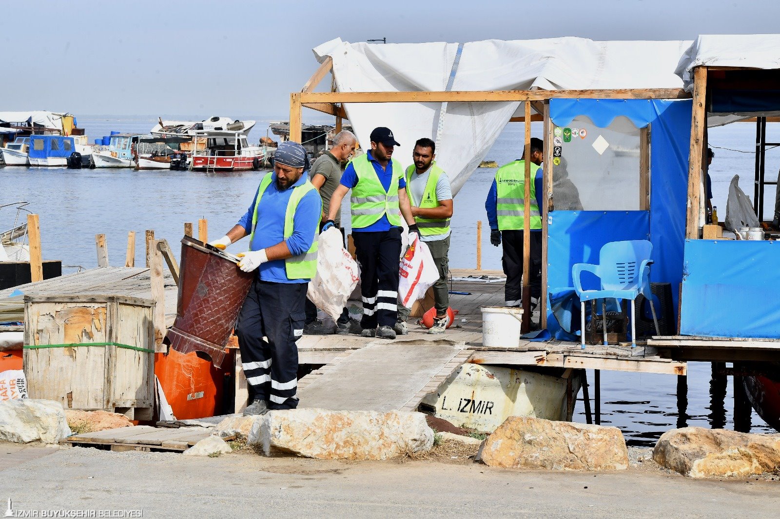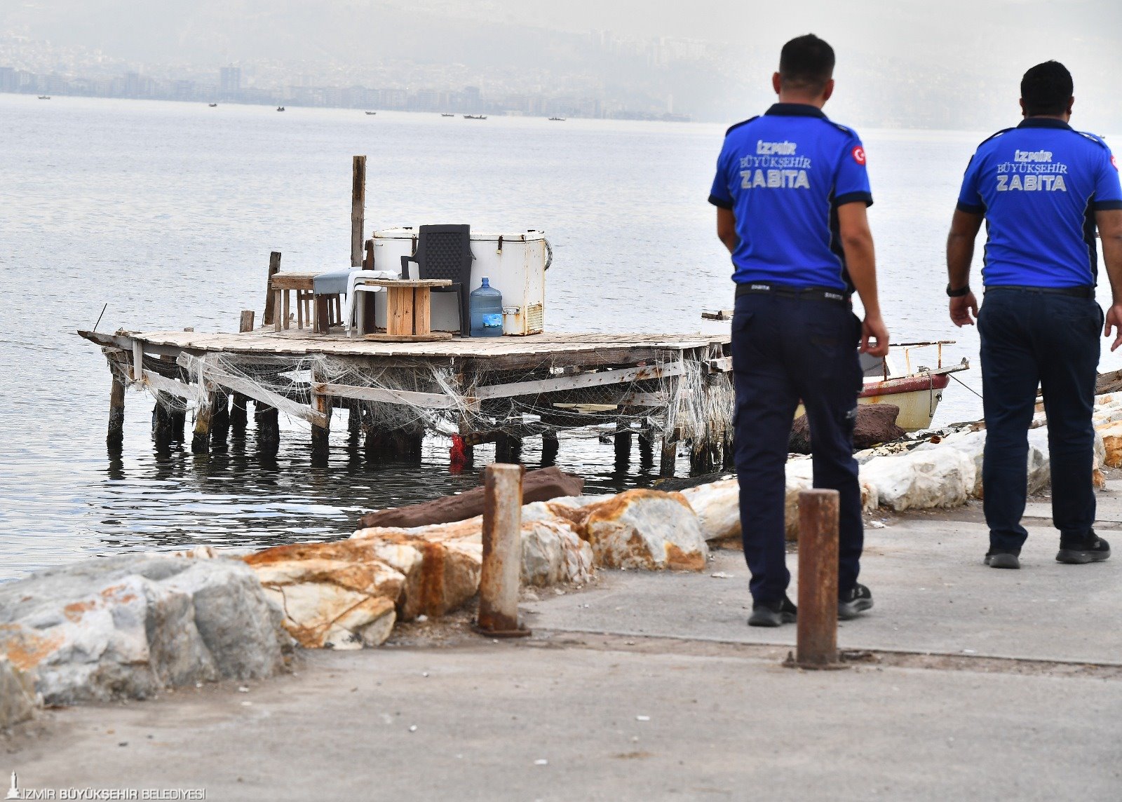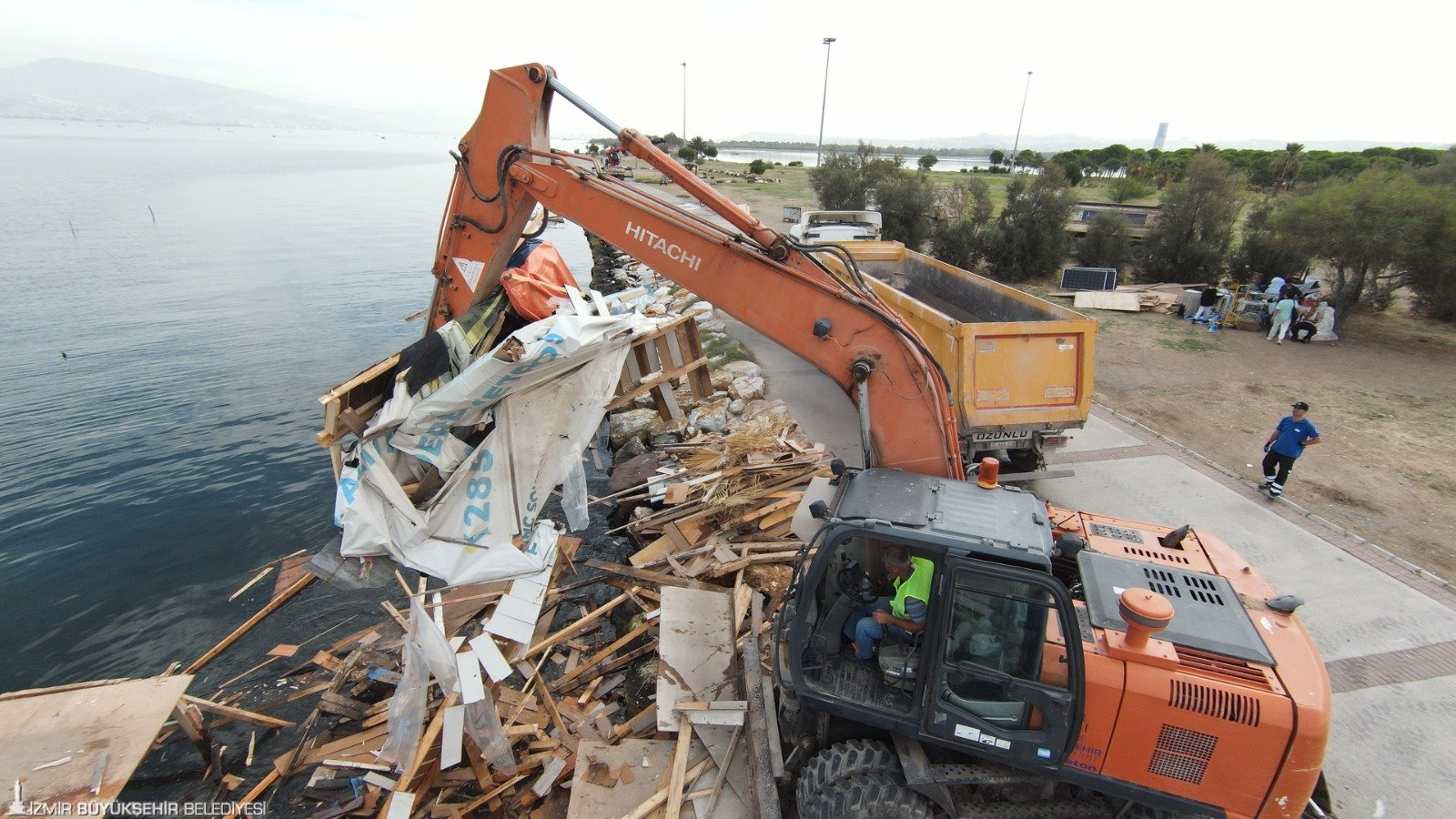 İzmir Emniyet Müdürlüğü ekiplerinin de destek verdiği çalışmada, kepçeler yapıları yıkarak denizden çıkardı. Toplanan atıklar belediye tarafından imha edilecek.