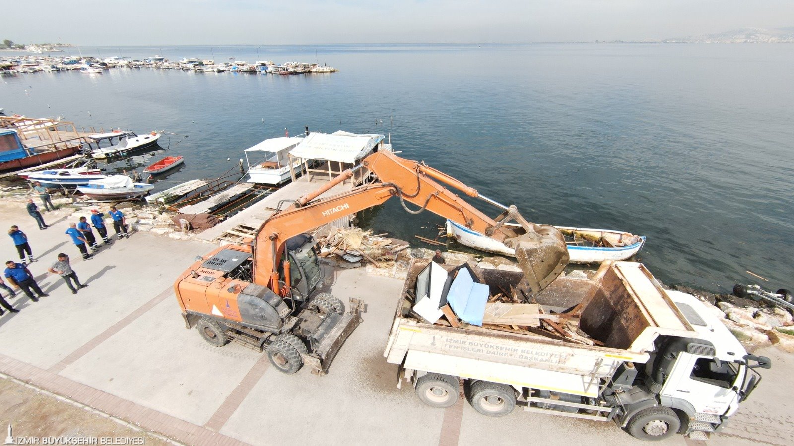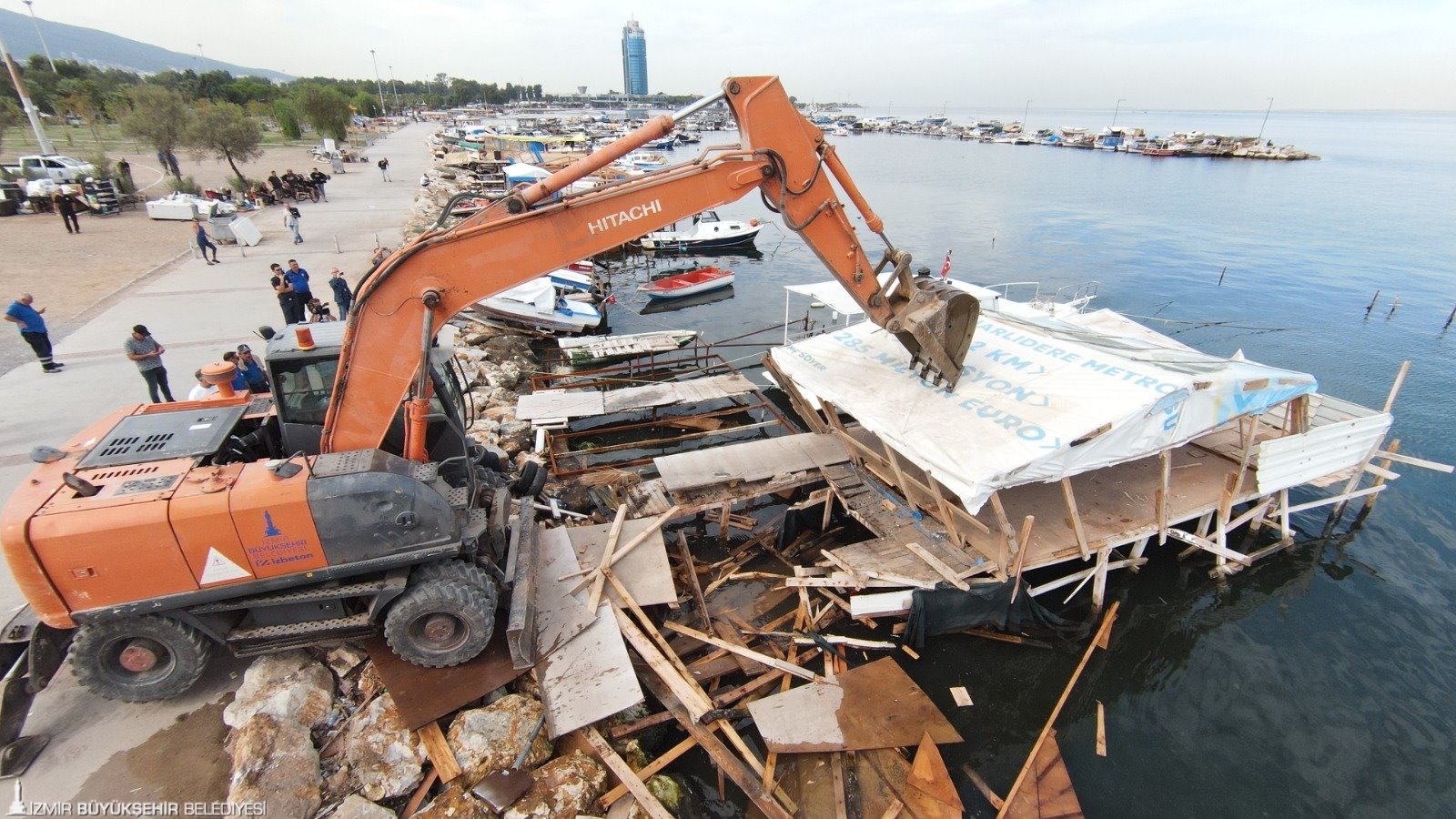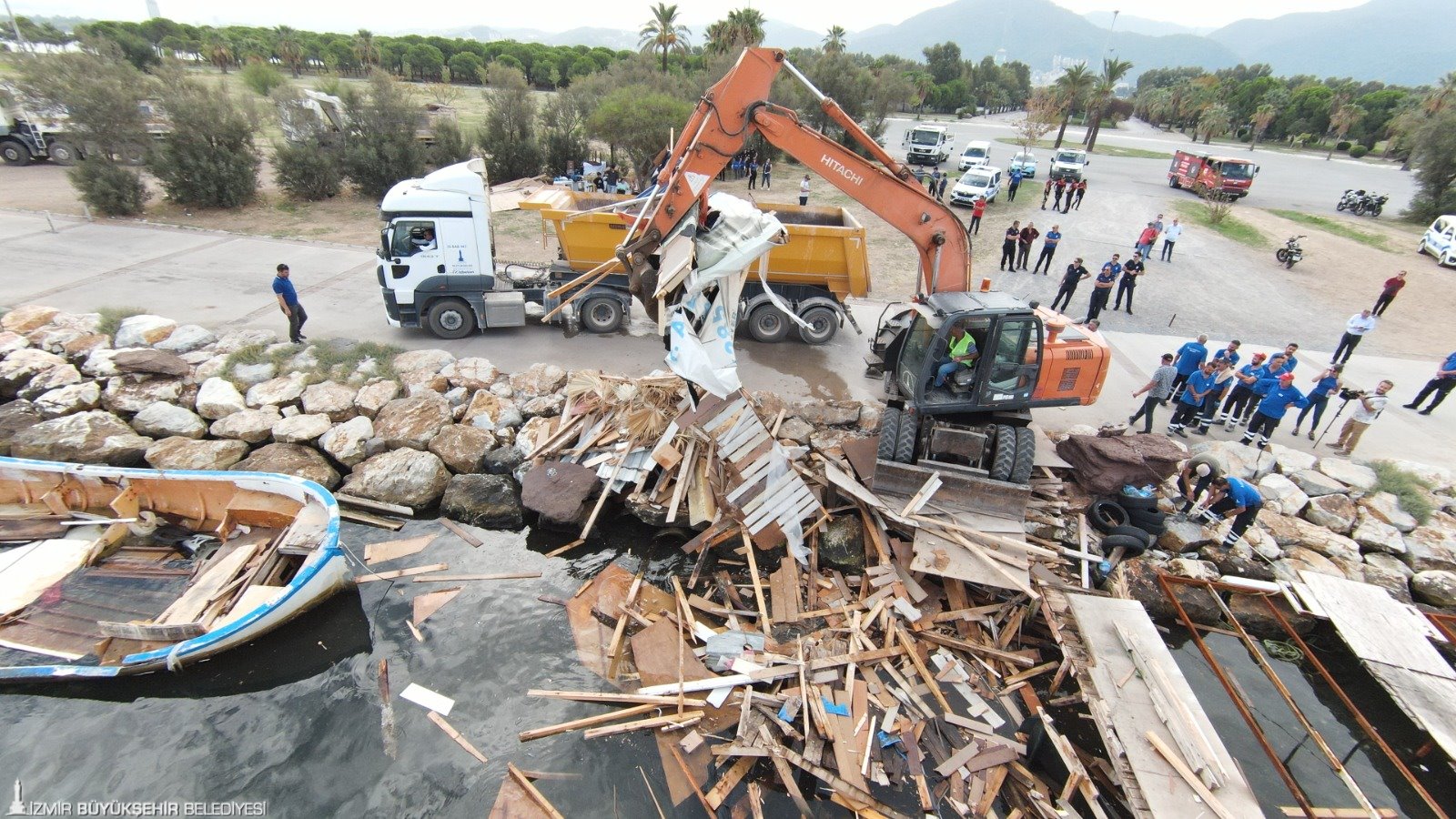 İzmir Emniyet Müdürlüğü ekiplerinin de destek verdiği çalışmada, kepçeler yapıları yıkarak denizden çıkardı. Toplanan atıklar belediye tarafından imha edilecek.