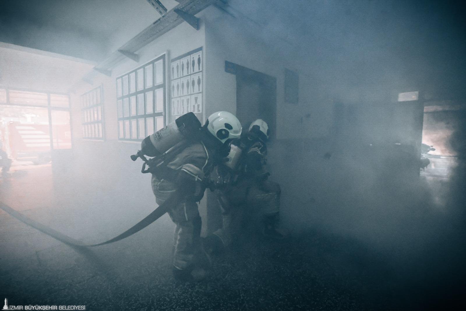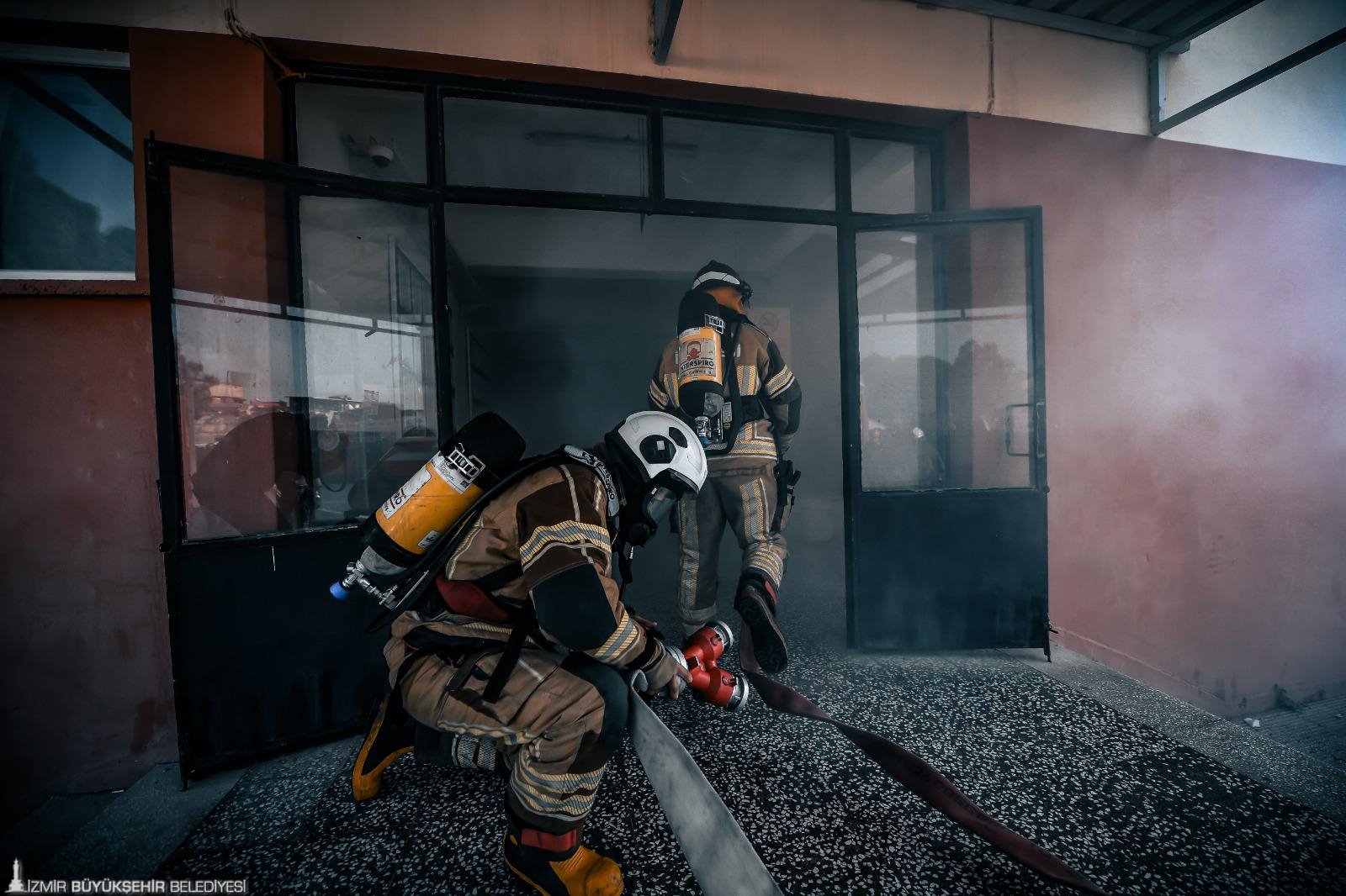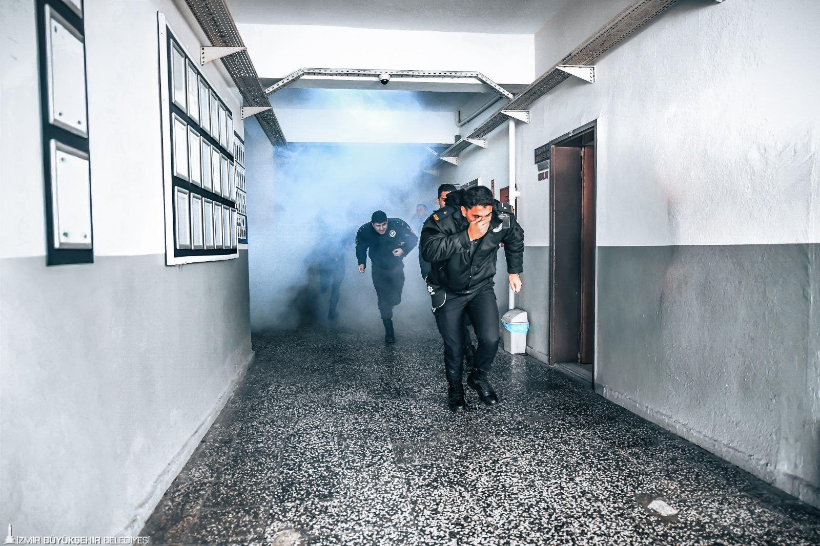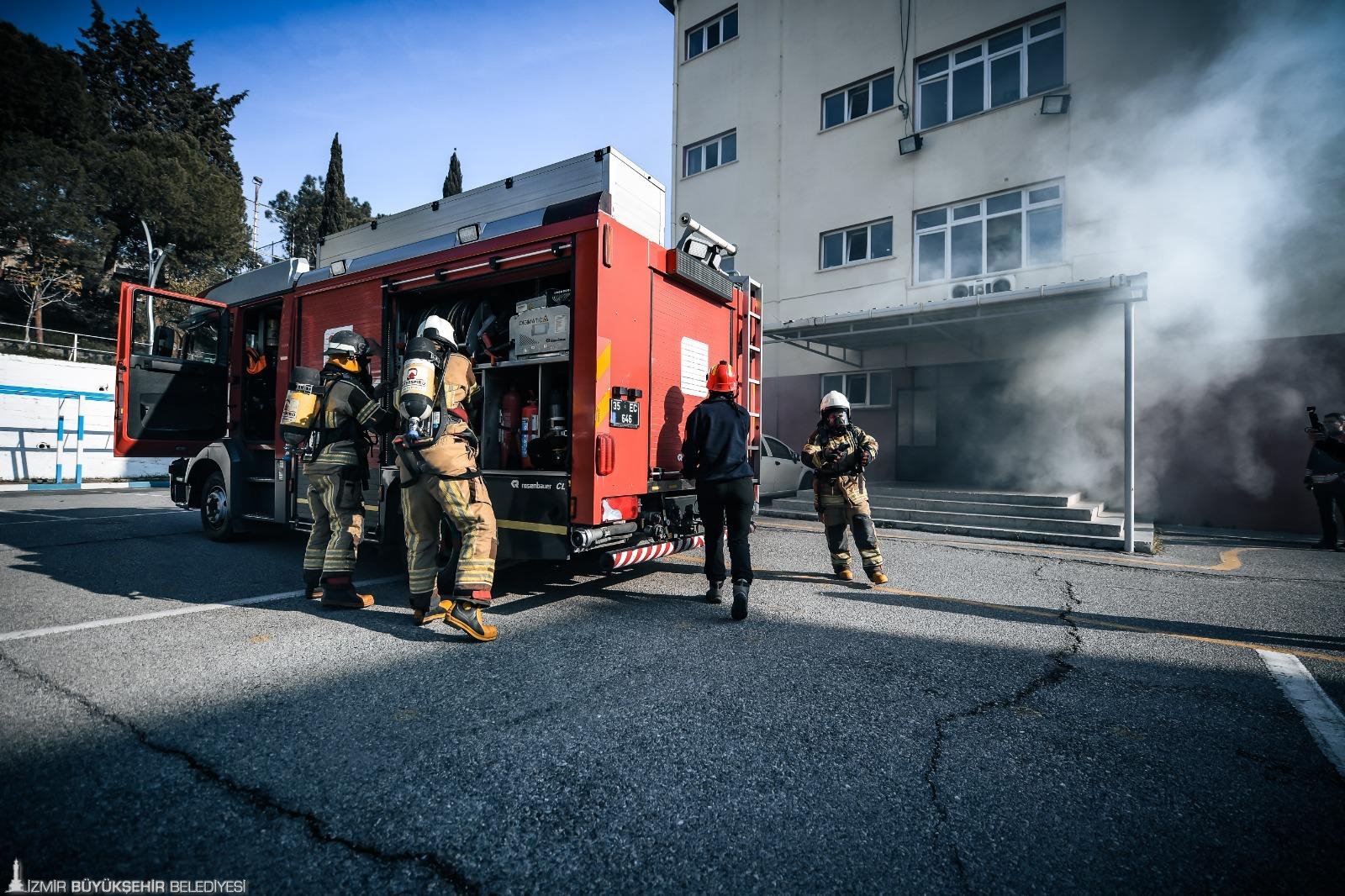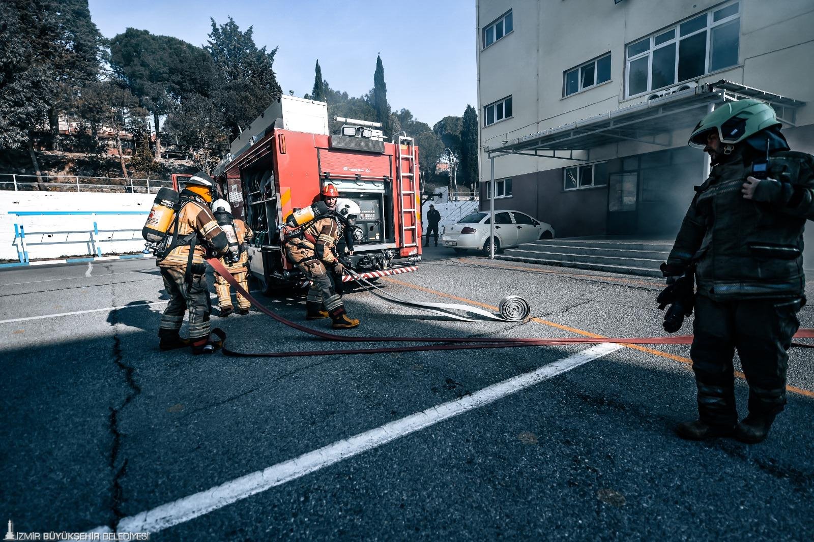 İzmir Büyükşehir Belediyesi İtfaiye Dairesi Başkanlığı ekipleri tarafından Buca’da bulunan Rüştü Ünsal Polis Meslek Yüksekokulu’nda yangın tatbikatı gerçekleştirildi. Tatbikat senaryosuna göre, 4 katlı binanın zemin katında yer alan bir derslikte elektrik hatlarından kaynaklanan bir yangın çıktı. Dumanların hızla binayı sarması üzerine vakit kaybetmeden 112 Acil Çağrı Merkezi’ne haber verildi. İhbar üzerine kısa sürede olay yerine ulaşan itfaiye ekipleri, yangına hızla müdahale ederek alevleri kontrol altına almayı başardı.
