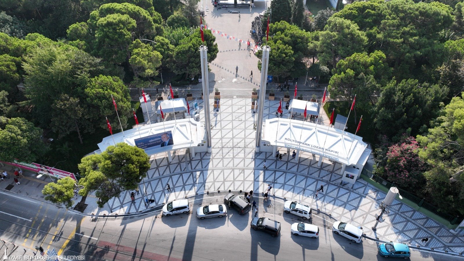 - İzmir Büyükşehir Belediyesi birimleriyle yürütülen ortak çalışmayla Kültürpark’ın Lozan Kapısı tarihine uygun olarak yenilendi.