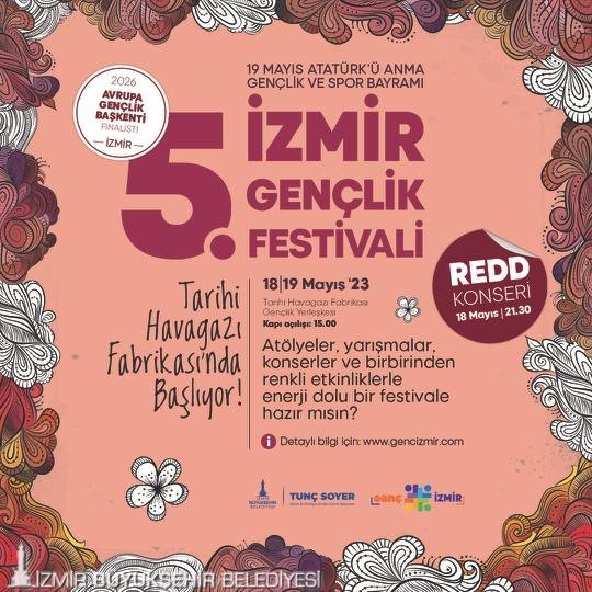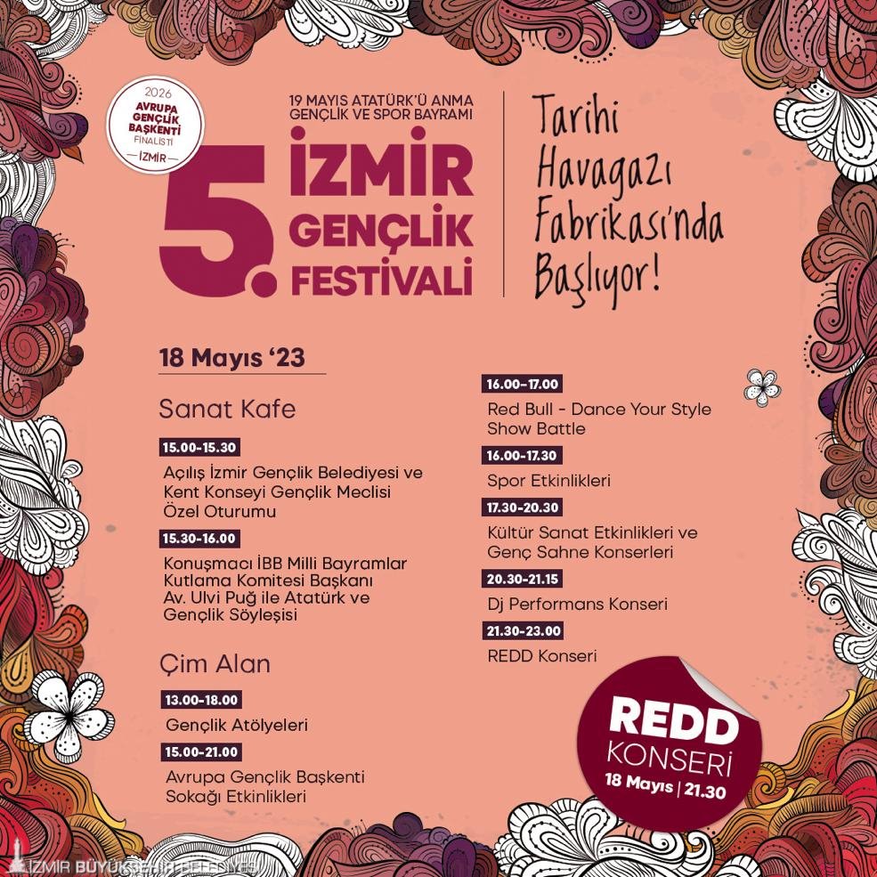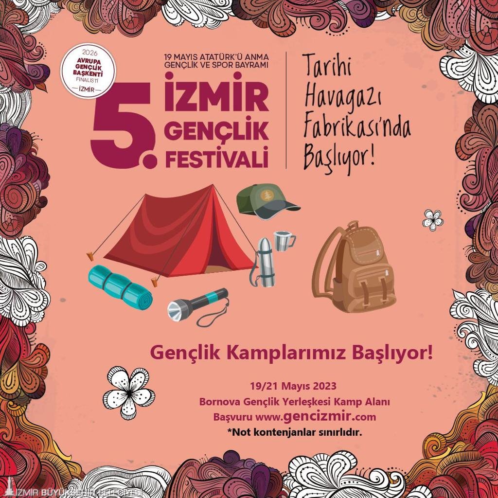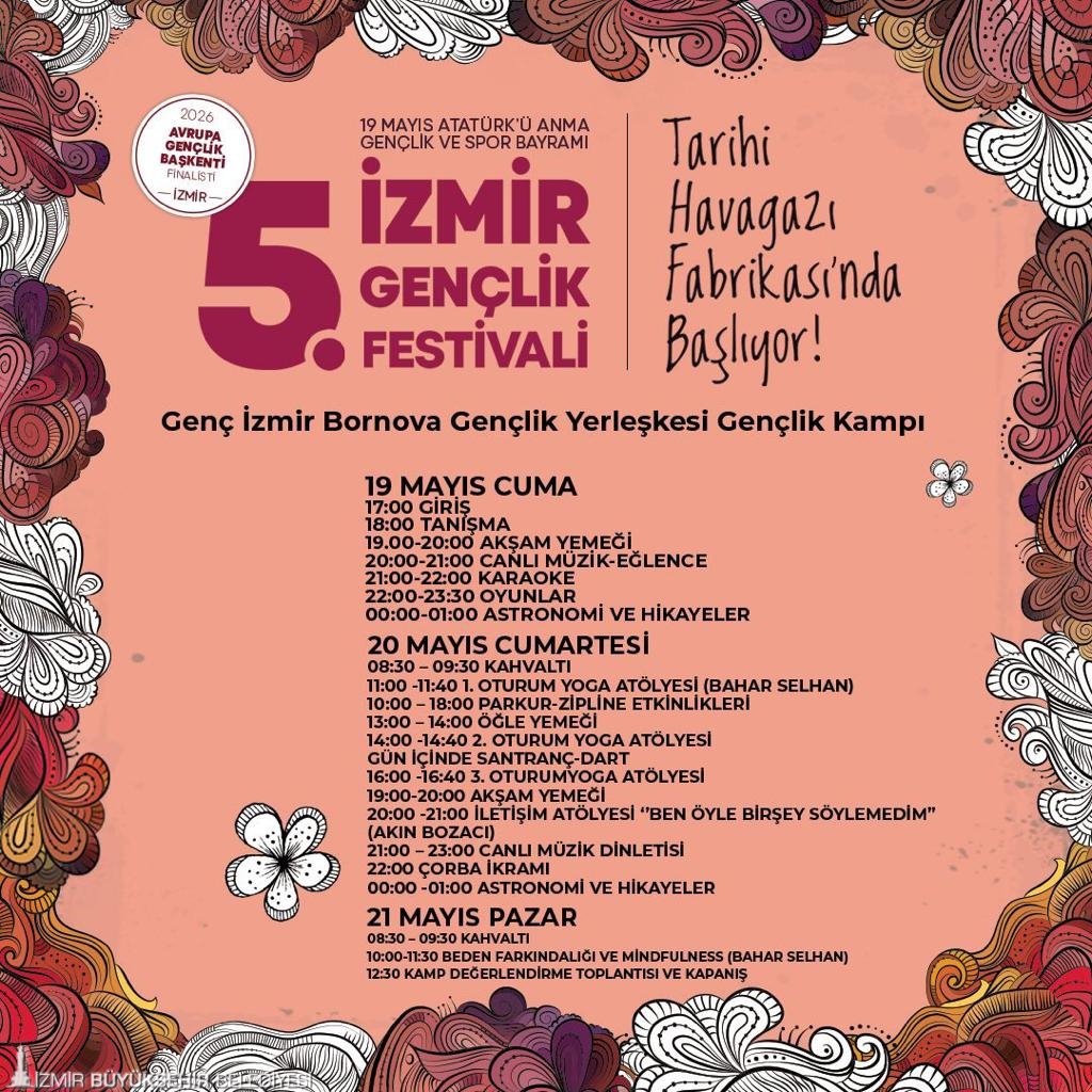 Türkiye’nin dört bir yanından kente gelen gençler, 19 Mayıs coşkusunu bu sene de İzmir’de doyasıya yaşayacak. İzmir Büyükşehir Belediyesi'nin 19 Mayıs Atatürk’ü Anma, Gençlik ve Spor Bayramı etkinlikleri kapsamında düzenleyeceği, Türkiye’nin en iyi festivali ödülünü alan İzmir Gençlik Festivali, beşinci kez gençlere bayram coşkusu yaşatacak. 18-19 Mayıs tarihlerinde Tarihi Havagazı Fabrikası Gençlik Yerleşkesi’nde düzenlenecek festival, 2026 Avrupa Gençlik Başkenti finalisti İzmir’in adını tüm dünyaya duyuracak.