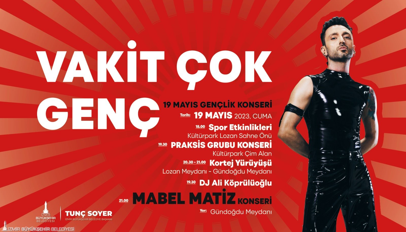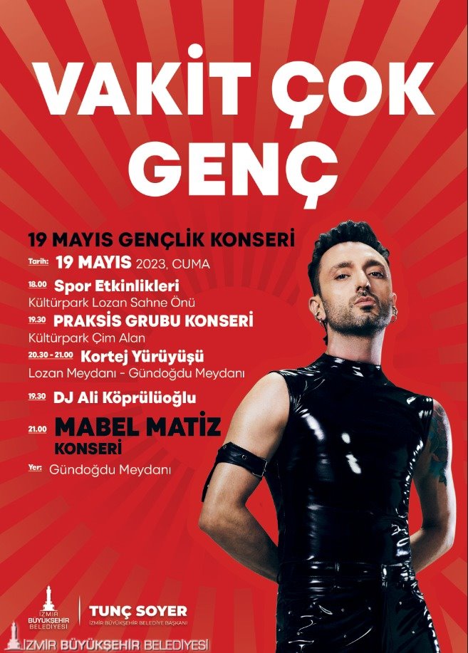 19 Mayıs Cuma günü ise 13.00 ile 18.00 saatleri arasında Tarihi Havagazı Fabrikası, gençlik atölyelerine ev sahipliği yapacak. 18.00’de Kültürpark Lozan kapısında spor etkinlikleri ile başlayacak program, 19.30’da Kültürpark’taki Praksis grubu konseriyle devam edecek. Gençler saat 20.30’da ise Başkan Tunç Soyer ile Kültürpark Lozan kapısından çıkarak Kordon’dan Gündoğdu Meydanı’na doğru yürüyüş ve fener alayına katılarak dev Atatürk posterini taşıyacak. Gündoğdu Meydanı’nda 19.30’da DJ Ali Köprülü’nün performansıyla başlayacak program ise saat 21.00’de Mabel Matiz konseriyle sürecek.