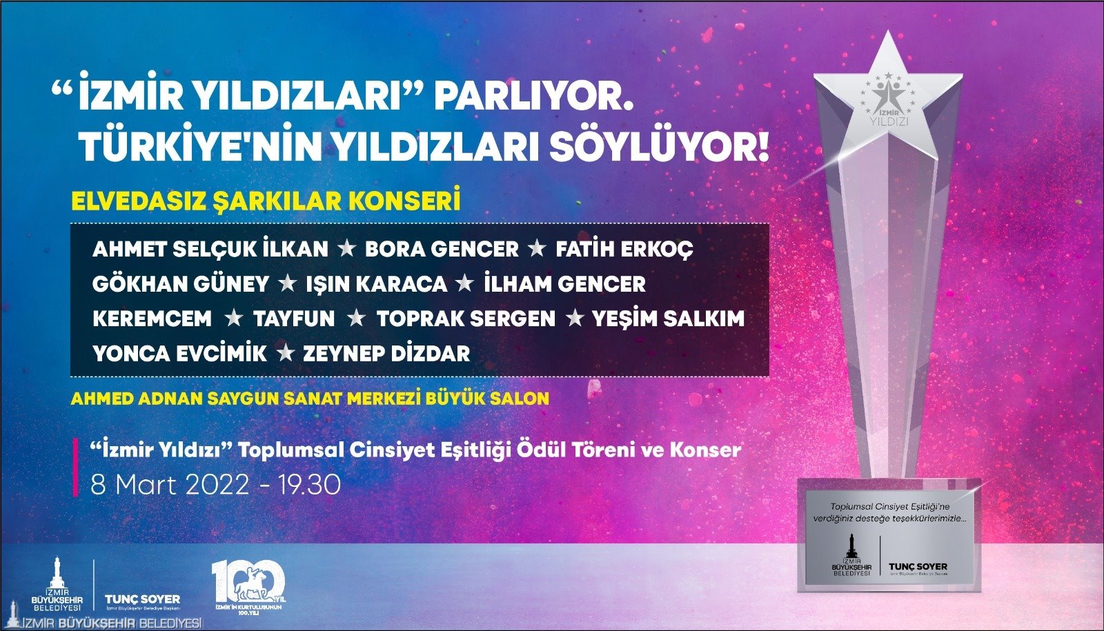 İzmir Büyükşehir Belediyesi’nin kadına yönelik her türlü şiddet ve ayrımcılığın önlenmesine yönelik iyi uygulama örneklerini ödüllendirdiği İzmir Yıldızı Ödül Töreni ise 8 Mart Salı günü saat 19.30’da Ahmed Adnan Saygun Sanat Merkezi’nde yapılacak. Ödül töreninin ardından Elvedasız Şarkılar konseri var. Ahmet Selçuk İlkan, Bora Gencer, Fatih Erkoç, Gökhan Güney, Işın Karaca, İlham Gencer, Keremcem, Tayfun, Toprak Sergen, Yeşim Salkım, Yonca Evcimik ve Zeynep Dizdar İzmirliler ile buluşacak.