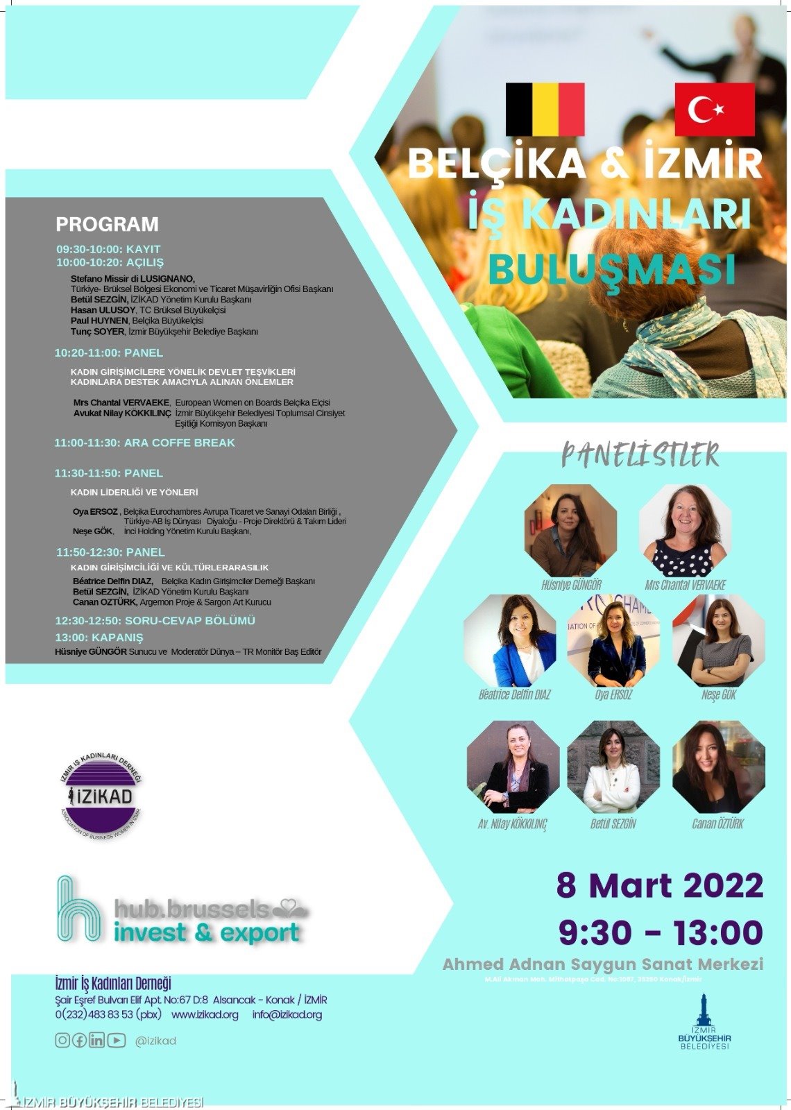 İzmir Büyükşehir Belediyesi Kent Ekonomisi ve Yenilikçi Endüstriler Şube Müdürlüğü ise İZİKAD (İzmir İş Kadınları Derneği) ve Türkiye-Brüksel Bölgesi Ekonomi ve Ticaret Müşavirliği Ofisi işbirliğiyle “Belçika İzmir İş Kadınları Buluşması” düzenliyor. 8 Mart’ta Ahmed Adnan Saygun Sanat Merkezi Küçük Salon’da 09.30-12.00 saatleri arasında yapılacak panelde “kadın girişimcilere yönelik devlet teşvikleri”, “kadın liderliği ve yönleri” ve “kültürlerarası kadın girişimciliği” başlıklarında oturumlar yapılacak.