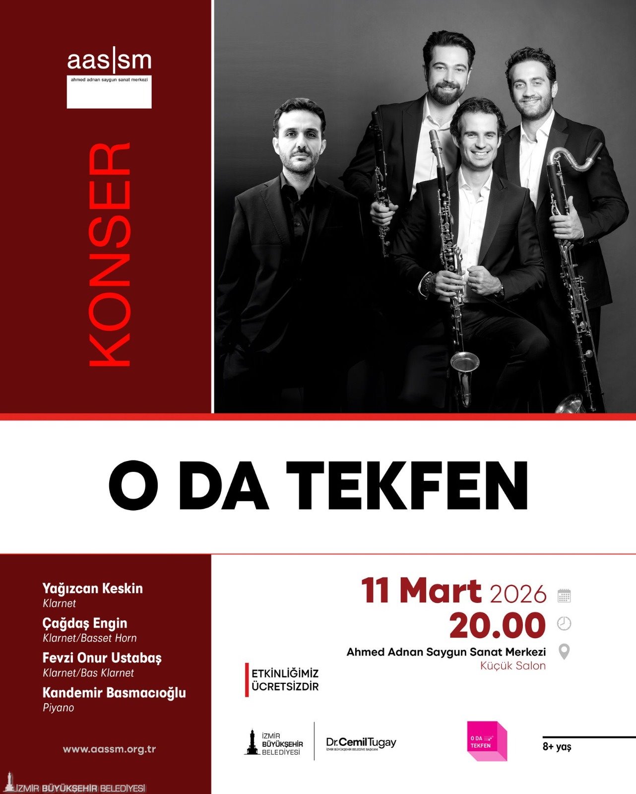 Tekfen Filarmoni’nin oda müziği projesi O da Tekfen, 11 Mart Çarşamba saat 20.00’de Küçük Salon’da ücretsiz olarak izleyiciyle buluşuyor. Yağızcan Keskin (klarnet), Çağdaş Engin (klarnet/basset horn), Fevzi Onur Ustabaş (klarnet/basklarnet) ve Kandemir Basmacıoğlu (piyano), klasik repertuvarın seçkin eserlerini üç klarnet ve piyano için hazırlanmış özel düzenlemeleriyle seslendirecek.