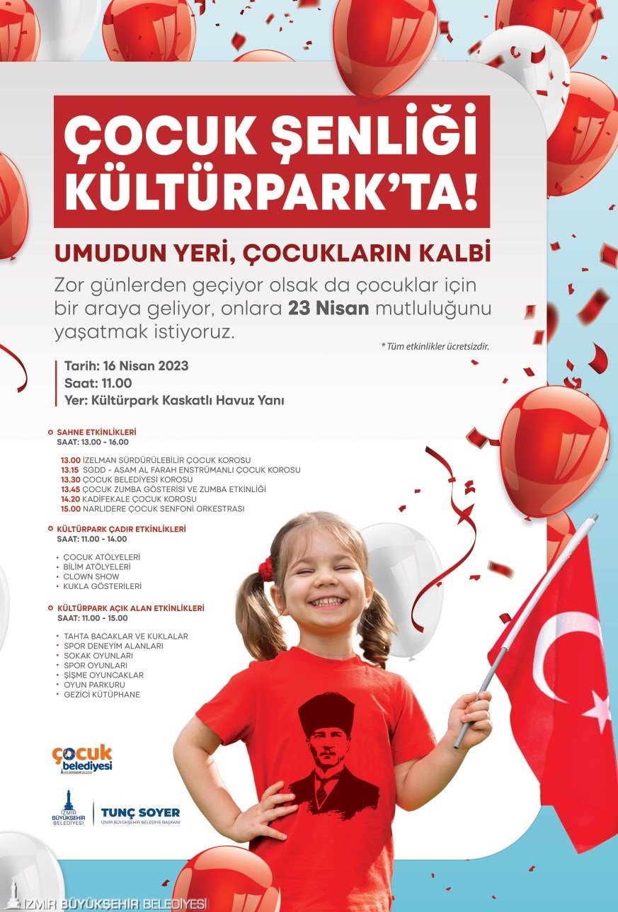 Kültürpark’taki Çocuk Şenliği 16 Nisan'da saat 11.00'de başlayacak. Kaskatlı Havuz yanında düzenlenecek programda 11.00 ile 14.00 arası çocuk, bilim ve kukla gösterilerinin olduğu çadır etkinlikleri yer alacak. Saat 13.00-16.00 arasında çocuk korolarının yer alacağı sahne etkinlikleri düzenlenecek. Açık alan etkinlikleri de saat 11.00-15.00 arasında yapılacak. Çocuklar kukla gösterileri, spor etkinlikleri, sokak oyunları, oyun parkuru, gezici kütüphane gibi birçok etkinlikle keyifli bir gün geçirecek.