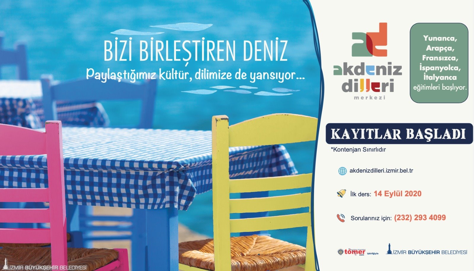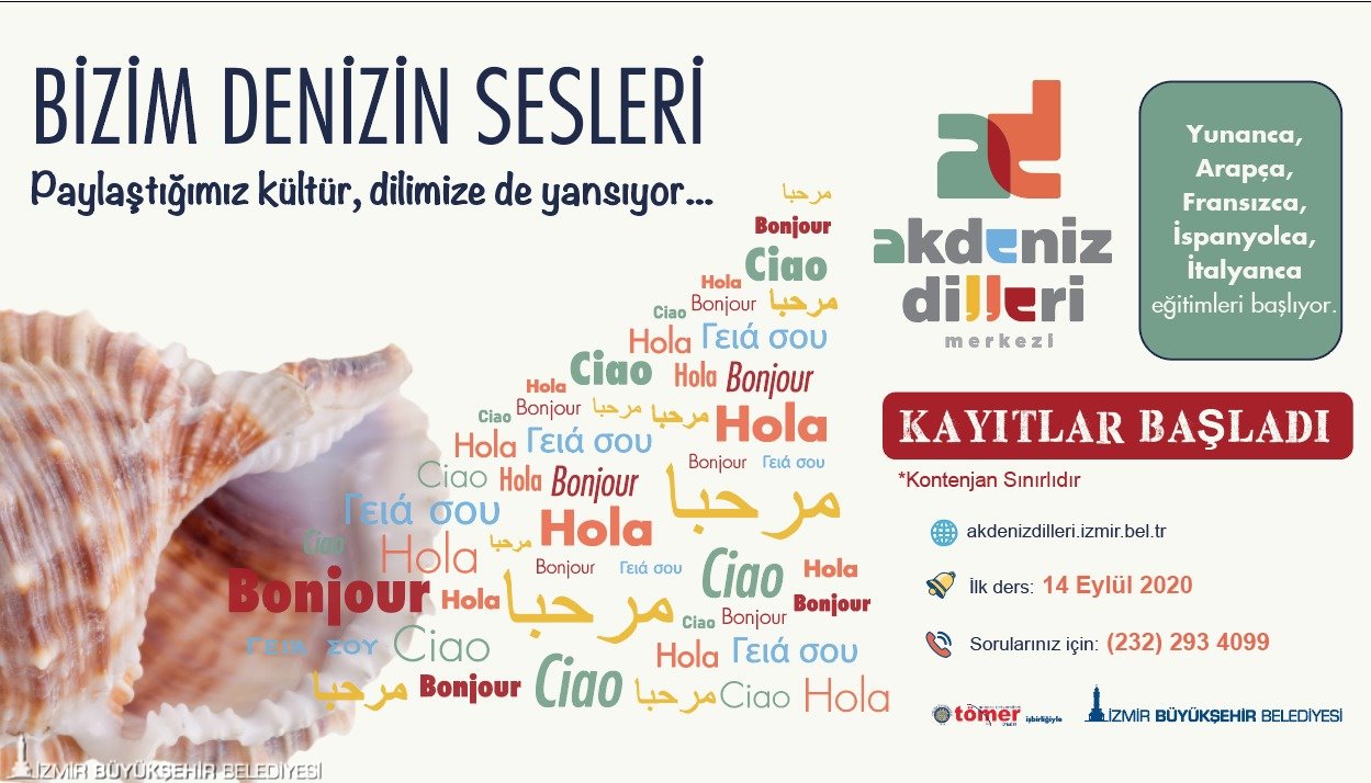 İzmir Büyükşehir Belediyesi Akdeniz Dilleri Merkezi’nde yabancı dil kursları için kayıtlar başladı. Akdeniz Dilleri Merkezi İtalyanca, İspanyolca, Yunanca, Arapça ve Fransızca olmak üzere Akdeniz’e kıyısı bulunan ülkelerin resmi dillerinde eğitim verecek. İzmir’in liman kenti kimliğini ve zengin tarihsel birikimi kentteki insanlara yatırım yaparak öne çıkarmayı hedefleyen Büyükşehir Belediyesi, bu proje ile Akdeniz’in tüm kentleriyle İzmir arasındaki kültürel alışverişi arttırmayı ve dostluk bağlarını daha da güçlendirmeyi planlıyor.