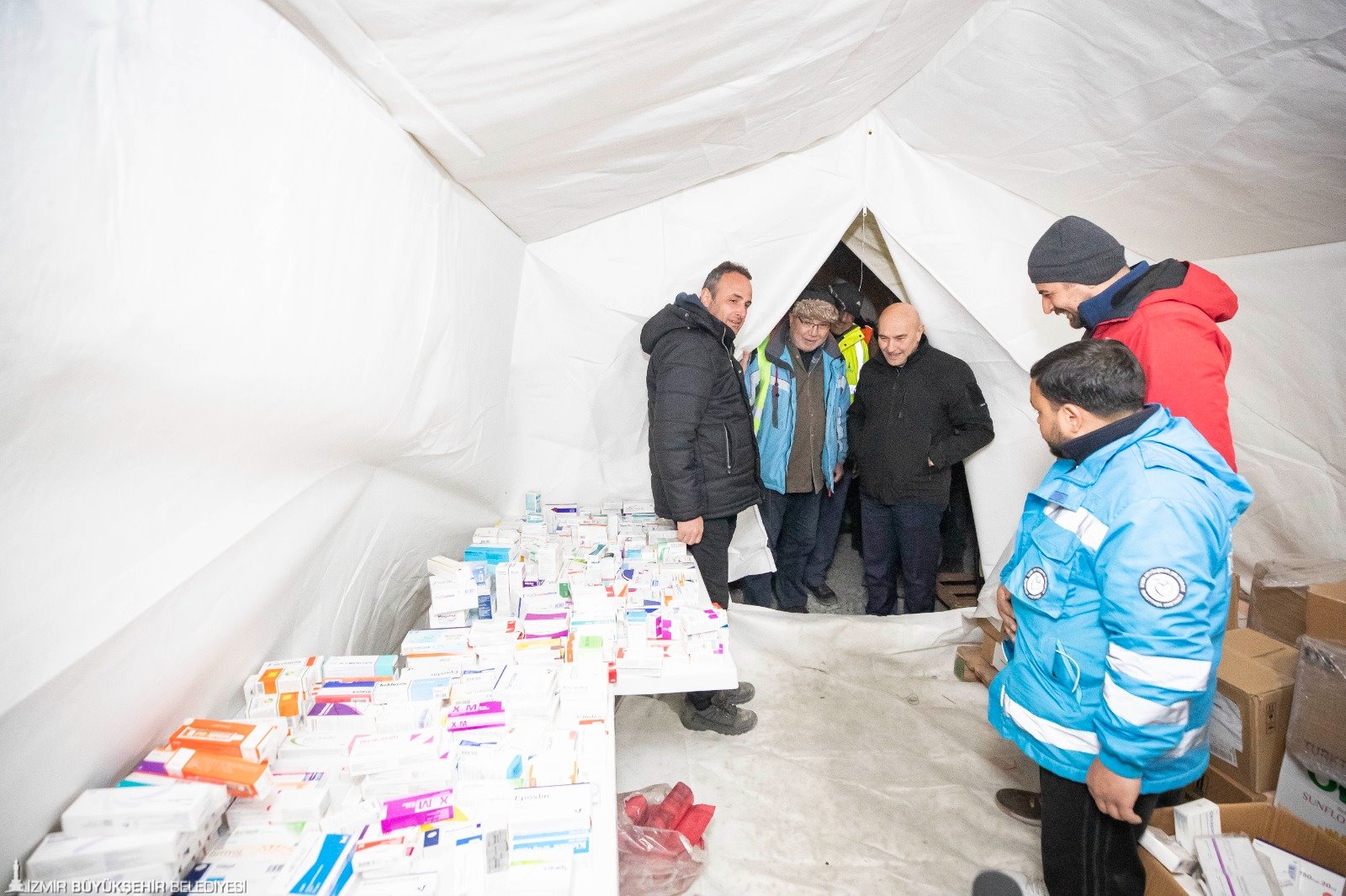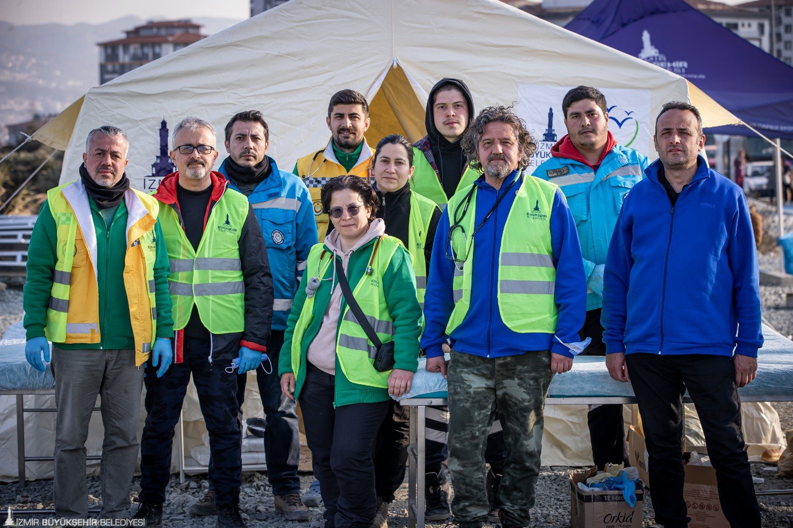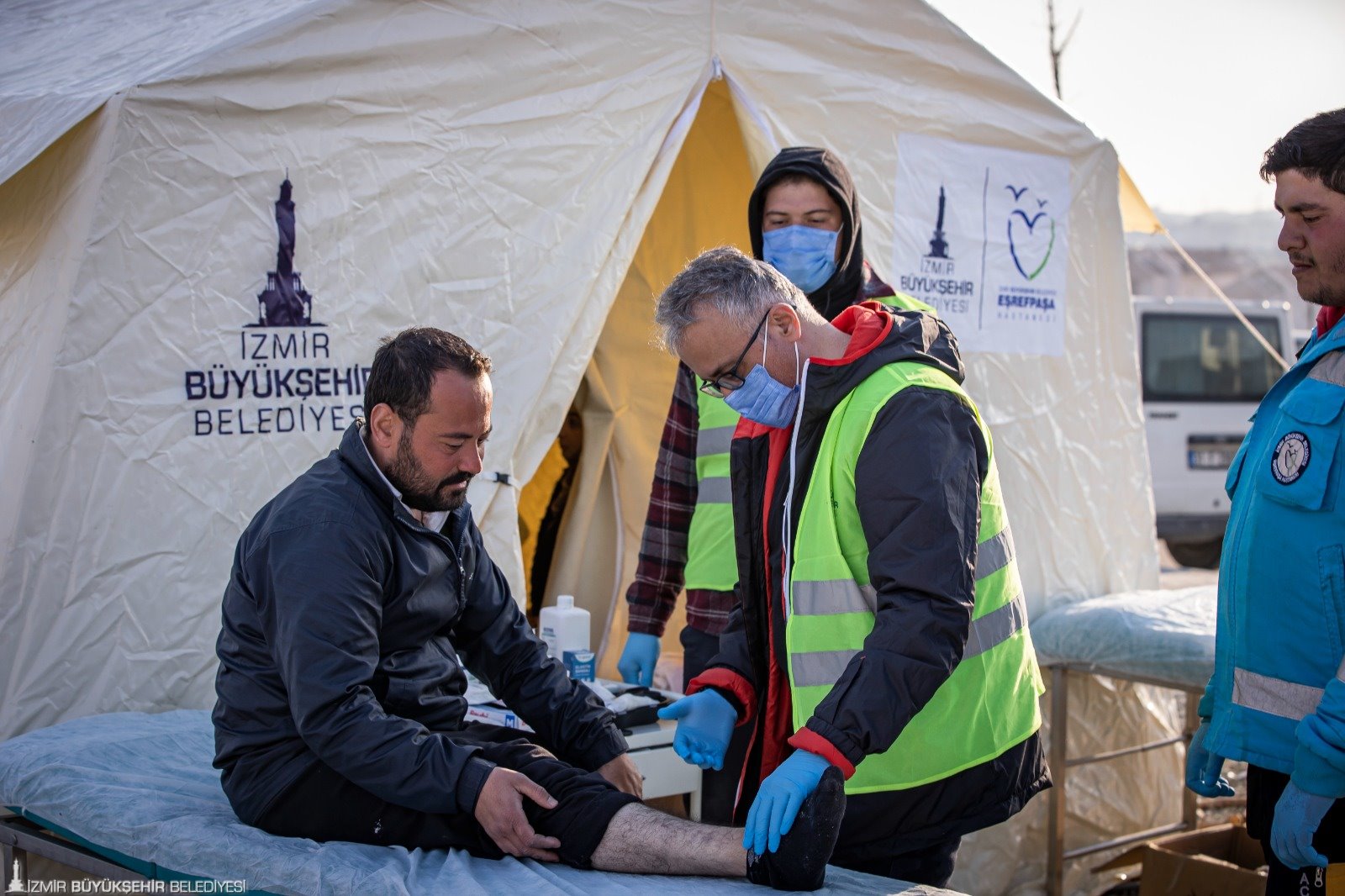 Ortopedi ve Travmatoloji Uzmanı Dr. Artun Aydın ise “Yaralı depremzedeleri tedavi ediyoruz. Çocuk hekimi, dahiliye hekimi, enfeksiyon hastalıkları hekimlerimiz var. Onlar da kendi branşlarında çalışmalarını sürdürüyor. Kronik rahatsızlığı olan hastaların ilaçları düzenli veriliyor, muayeneleri yapılıyor. Salgın tehdidine karşın çadırların arasında ilaçlama çalışmaları yapıyoruz. Depremzedelerimize hijyen paketleri, maske, eldiven ve dezenfektan veriyoruz” dedi.