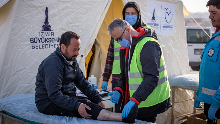 İzmir Büyükşehir Belediyesi’nin deprem bölgesinde hizmet vermek üzere bölgeye yolladığı sayısı bine yaklaşan personel arasında Eşrefpaşa Hastanesi’ne bağlı sağlık ekipleri de bulunuyor. Hatay Expo alanında kurulan koordinasyon merkezinde hekimler muayene ve tedavi hizmetlerini sürdürürken, salgın hastalıklara karşı da önleyici çalışmalar yürütüyor. İzmir Büyükşehir Belediye Başkanı Tunç Soyer de şu anda revir olarak hizmet veren, kısa süre içinde sahra hastanesine dönüşecek merkezi Eşrefpaşa Hastanesi Başhekimi Devrim Demirel ile inceledi. Başkan Soyer, bölgede bir sahra hastanesi kurmak üzere hazırlıkların tamamlanmak üzere olduğunu belirterek “Sağlık hizmetimizin kapsamını genişleteceğiz. Bu hizmetleri geçici değil, kalıcı olarak sürdürmeye kararlıyız” dedi.