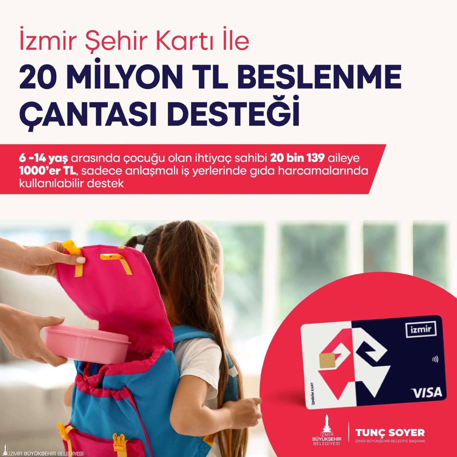 İzmir Büyükşehir Belediye Başkanı Tunç Soyer’in, Türkiye’de yaşanan ağır ekonomik kriz şartlarını bir nebze hafifletmek ve kentteki hiçbir çocuğu temel ihtiyaçlarından mahrum bırakmamak için hayata geçirdiği “beslenme çantası” desteği ailelerin yüzünü güldürüyor. İzmir Büyükşehir Belediyesi Sosyal Hizmetler Dairesi Başkanlığı’nın yaptığı incelemeler neticesinde tespit edilen, 6-14 yaş arasında çocuğu olan ihtiyaç sahibi 20 bin 139 ailenin İzmir Şehir Kartlarına 1000’er TL tutarında beslenme çantası desteği ödemesi yapıldı. Toplam 20 milyon 139 bin TL’lik destek, sadece anlaşmalı işyerlerinde yapılacak alışverişlerde kullanılabilecek. Böylece hem derinleşen ekonomik krizde ihtiyaç sahibi ailelerin çocuklarının eksiklerini gidermesi sağlanacak hem de yerel esnaf güçlendirilmiş olacak.