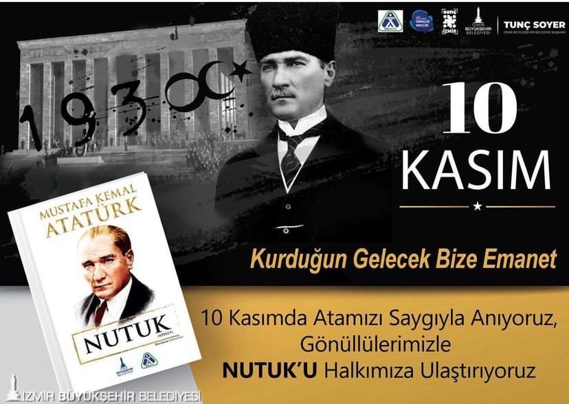 “Kurduğun Gelecek Bize Emanet” sloganıyla İZELMAN tarafından bastırılan Mustafa Kemal Atatürk’ün Nutuk kitabı İzmirlilere ulaştırılacak. 10 Kasım’da 08.30 ile 09.30 saatleri arasında 16 farklı noktada Genç İzmir gönüllüleri ve İzmir Kent Konseyi Gençlik Meclisi üyeleri özel baskılı tişörtlerle Nutuk dağıtacak.
