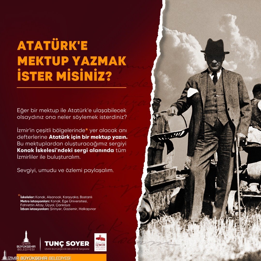 İzmir Büyükşehir Belediyesi kentlileri Ata’ya mektup yazmaya da çağırıyor. 10 Kasım’da metro istasyonları ve vapur iskelelerine anı defterleri yerleştirecek. Anı defterlerine yazılan satırlar ise Ahmet Piriştina Kent Arşivi ve Müzesi (APİKAM) tarafından “Senin Atatürk’ün” başlığıyla Konak Meydanı’ndaki sergi alanında İzmirliler ile buluşturulacak. Anı defterleri Konak, Ege Üniversitesi, Fahrettin Altay, Üçyol ve Çankaya metro istasyonlarında, Karşıyaka, Bostanlı, Konak, Alsancak vapur iskeleleri ile Şirinyer, Gaziemir, Halkapınar İZBAN istasyonlarında yer alacak.
