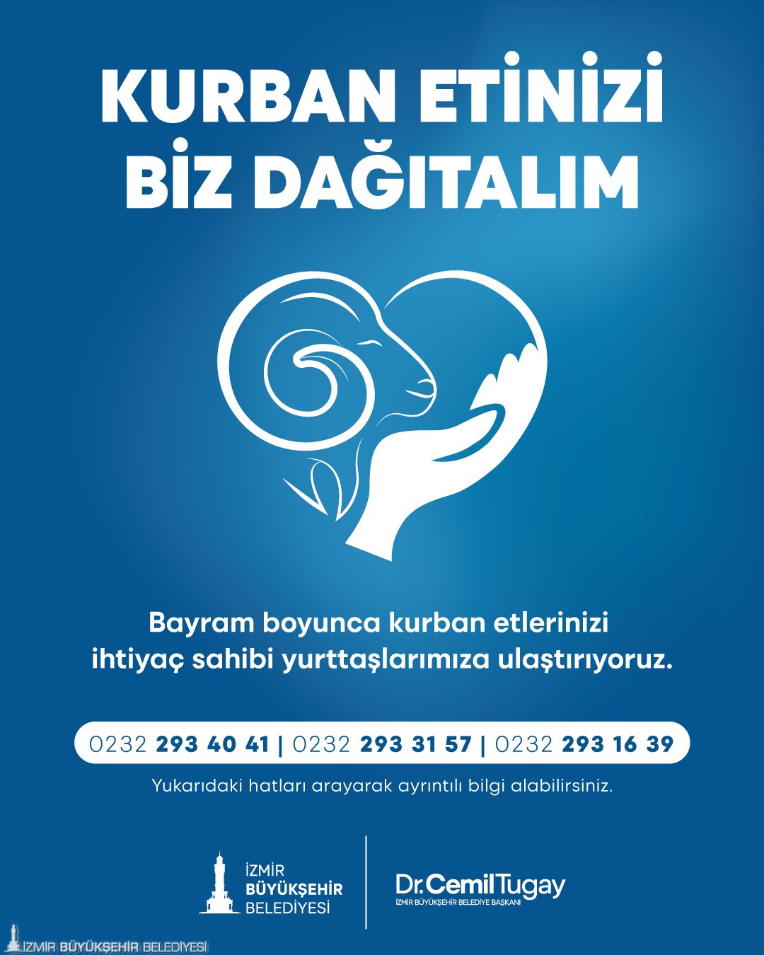 İzmir Büyükşehir Belediye Başkanı Dr. Cemil Tugay, zor bir haftadan geçildiğini belirterek “Bu hafta yaşadığımız krizi sizin desteğinizle aştık. Onun için her birinize yürekten tekrar tekrar teşekkür ediyorum. Yarın Kurban Bayramı, öncelikle bayramınızı kutlamak isterim. Aileniz ve sevdikleriniz ile çok güzel bir bayram diliyorum. Bayram boyunca dua edecek, kurban kesecek yurttaşlarımıza ‘Allah kabul etsin’ diyorum. Bu sene Kurban bağışı kampanyası yapmak istedik. Ne yazık ki valilik izin vermedi. O nedenle başka bir alternatif düşündük. Eğer kestiğiniz kurbanları yoksul ve ihtiyacı olan insanlara ulaştırmak isterseniz şehrin 13 farklı noktasında arkadaşlarımız sizin bağışladığınız kurban etlerini toplayacaklar, bunları soğuk hava depolarında saklayacaklar, bayram boyunca ihtiyacı olan binlerce, belki on binlerce yurttaşımıza ulaştıracaklar. Bağışlanan etlerin ihtiyaç sahiplerine gideceğinden hiçbir şüpheniz olmasın. Ülkemizin, şehrimizin her türlü felaketten, sıkıntıdan, dertten uzak olması, önümüzdeki günlerin aydınlık ve ferahlık içinde olması için biz de sizlerin hayırlarınıza aracılık etmiş olacağız. Bunun için de desteklerinizi bekliyoruz” dedi.