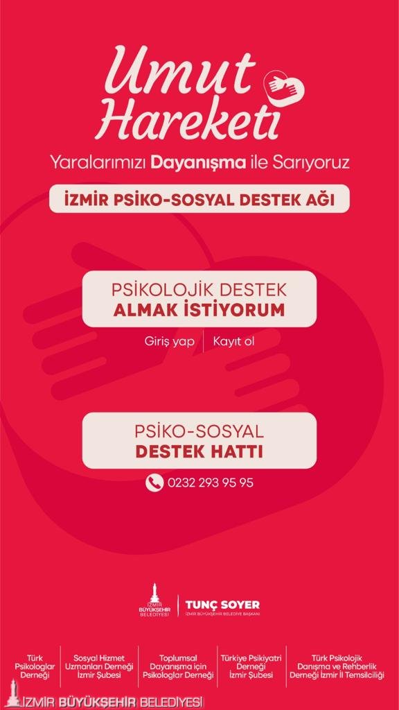 Depremden etkilenen yurttaşlar destek sağlayabilmek amacıyla oluşturulan “Psikososyal Destek Hattı”na (0232) 293 95 95 numaralı telefondan ulaşılabilir.