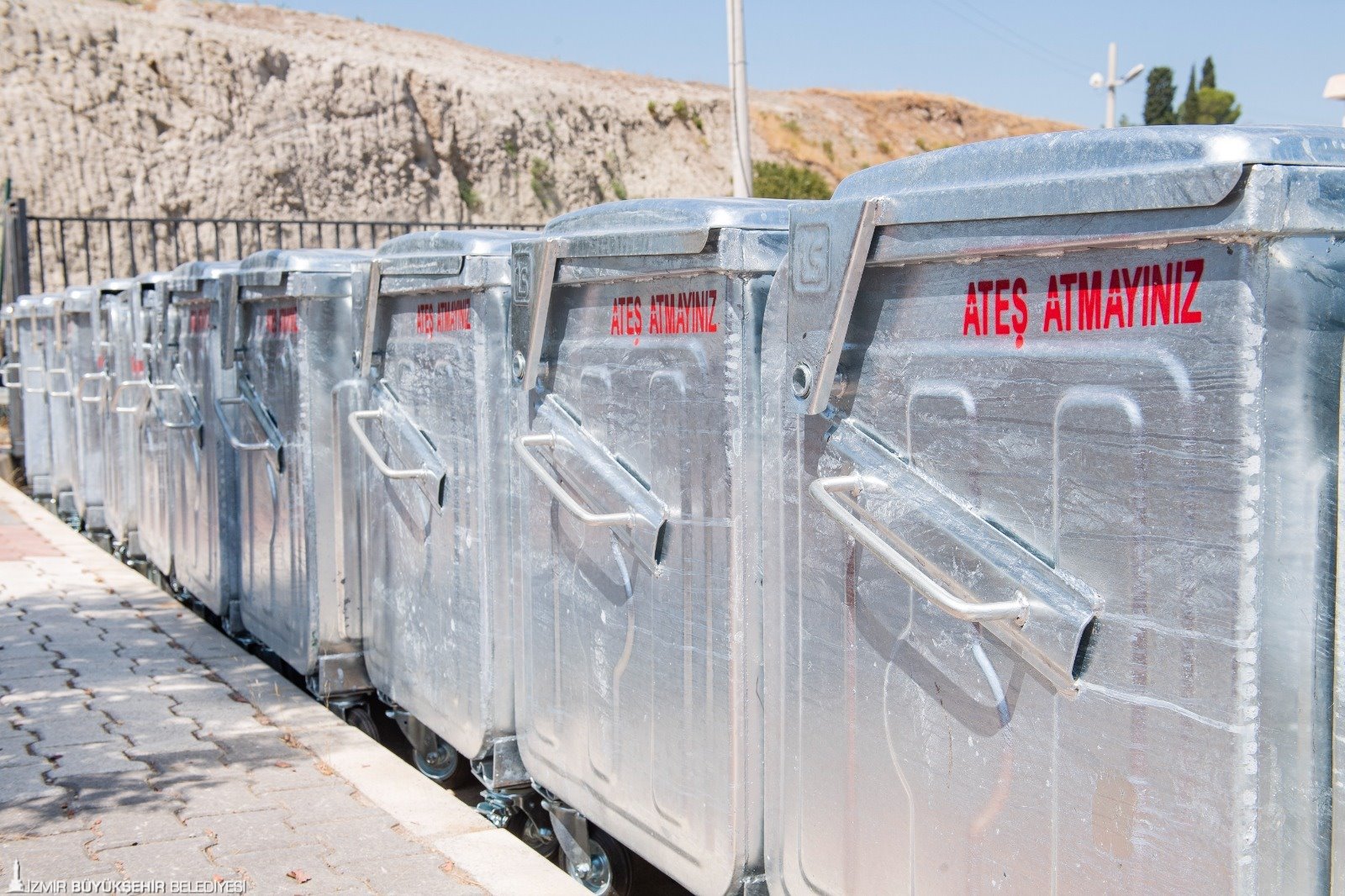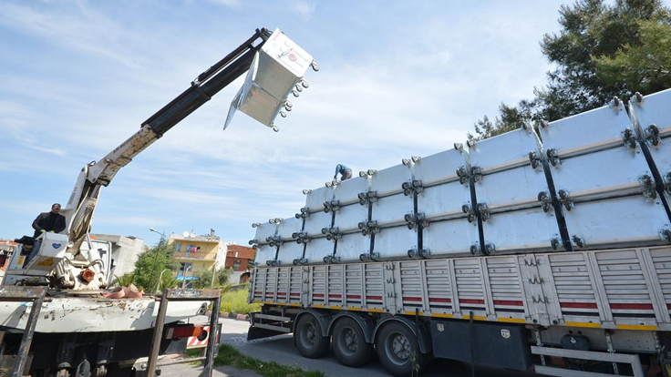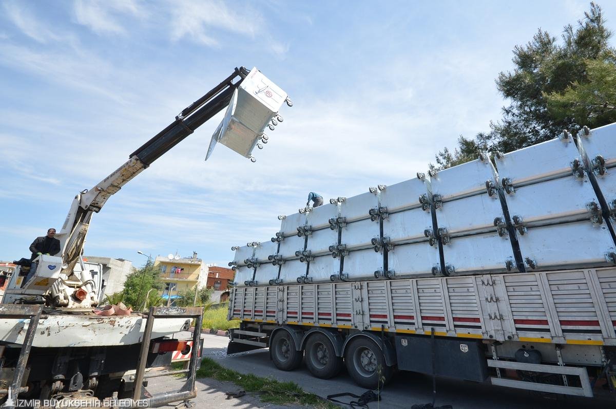 İzmir Büyükşehir Belediyesi daha temiz ve sağlıklı bir kent hedefiyle çalışmalarını sürdürüyor. İlçe belediyelerinin temizlik hizmetlerine modern araçlarla destek olan Büyükşehir Belediyesi, bir yandan da çöp konteyneri dağıtıyor. Büyükşehir son olarak 30 ilçe belediyesine toplam 5 bin 500 yeni çöp konteyneri hibe etti. Geçen yıl dağıtılan 6 bin çöp konteyneri ile hibe edilen çöp konteyneri sayısı 11 bin 500'e ulaştı. Çöp konteynerlerinin dağıtımı ilçelerin nüfus yoğunluğuna göre belirlendi. TSE'ye uygun, galvaniz kaplamalı metal çöp konteynerlerinin kapasitesi ise 770 litre.