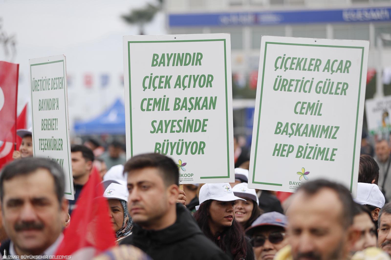 İzmir Büyükşehir Belediyesi tarafından kurulan, kooperatif ürünlerinin satıldığı, üreticinin alın terini koruyan İZMAR mağazalarının sayısının yakında 20’ye ulaşacağını söyleyen Tugay, “Önümüzdeki sene belki 40 ya da 50 olacak. İzmir’in her yerinden İZMAR açılması için talep geliyor. O marketlerde sizlerin ürünleri satılacak. Sebze meyveler için özel marketler kuracağız. Restoranlar, oteller, turizm işletmeleri kaliteli ve iyi ürünü uygun fiyata alsın diye büyük toptancı marketleri açacağız. Bunların hepsi sizin üretmenize ihtiyaç duyuyor. Siz ürettikçe oralarda insanlar daha iyi ürünlerle, daha iyi fiyatlarla buluşacaklar. Kadın kooperatiflerimiz için de bir şey söyleyeyim; her birisini kendi ürettiklerini sattıkları ortamlarda sıkça görüyorum. İyi ki varsınız. Geçenlerde balık halimizin başkanı ile konuştum. Kadın kooperatiflerimiz ile şehir içerisinde uygun noktalarda balık ekmek stantları oluşturacağız. Normalde satılan fiyatın altına balık getireceğiz. Bunu yaparken sadece balıkçılara ve kadınlarımıza değil aynı zamanda o ürüne uygun fiyatla ulaşmaya ihtiyacı olan gençlerimize, ihtiyaç sahibi insanlarımıza da hizmet etmiş olacağız” dedi.