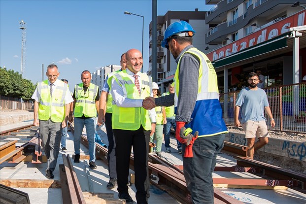 İzmir Büyükşehir Belediyesi’nin raylı sistem çalışmaları sürüyor. Yüzde 76’sı tamamlanan Çiğli Tramvayı hattında incelemelerde bulunan İzmir Büyükşehir Belediye Başkanı Tunç Soyer, projede çalışan işçilerin Kurban Bayramı’nı da kutladı.