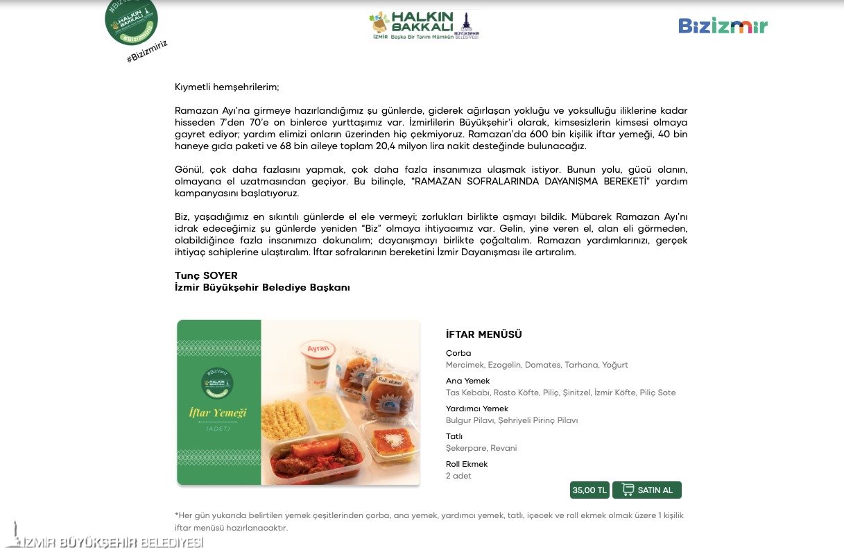 İzmir Büyükşehir Belediye Başkanı Tunç Soyer’in “sosyal belediyecilik” anlayışı doğrultusunda İzmir Büyükşehir Belediyesi giderek ağırlaşan yaşam koşullarına karşı bu Ramazan ayında da iftar bereketini büyütüyor. Büyükşehir Belediyesi Ramazan’da 600 bin kişilik iftar yemeği, 40 bin haneye gıda paketi dağıtacak ve 68 bin haneye hane başına 300’er lira olmak üzere toplam 20 milyon 400 bin lira nakit desteğinde bulunulacak. İftar bereketini büyüterek Ramazan sofralarına destek olmak isteyen yurttaşlar ise Halkın Bakkalı web sitesi üzerinden 35 liralık iftar yemeği satın alabilecek. Satın alınan paketler İzmir Büyükşehir Belediyesi tarafından ihtiyaç sahiplerine ulaştırılacak.