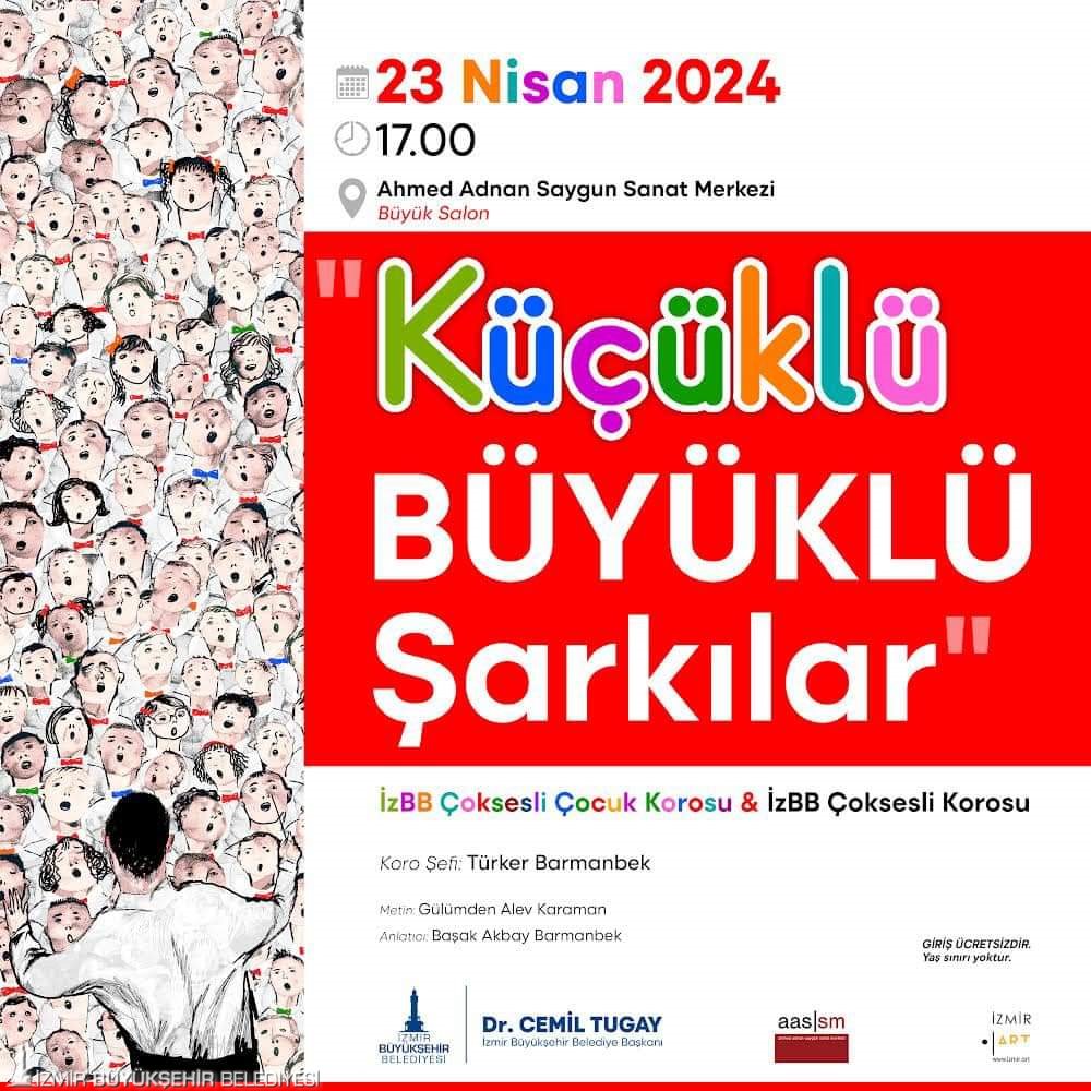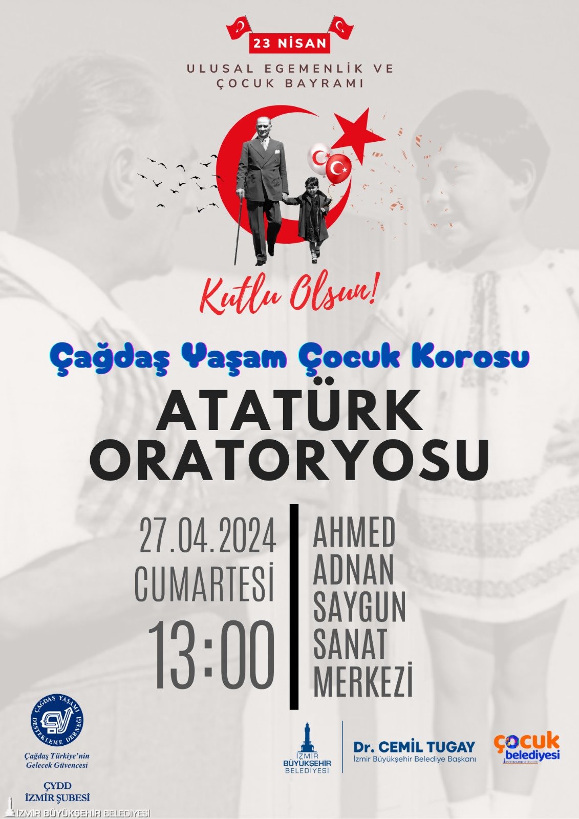 27 Nisan 2024 Cumartesi günü saat 13.00’te İzmir Ahmed Adnan Saygun Sanat Merkezi’nde İzmir Büyükşehir Belediyesi ile Çağdaş Çağdaş Yaşamı Destekleme Derneği iş birliğiyle “Çağdaş Yaşam Çocuk Korosu” Atatürk Oratoryosu’nu sunacak. Etkinlik ücretsiz yapılacak. 24 ve 26 Nisan tarihlerinde ise Kültürpark Atatürk Açık Hava Tiyatrosu’nda saat 19.00’da çocuklar ve aileleri için ücretsiz müzikli tiyatro gösterileri olacak. 24 Nisan’da Kral Şakir : Kapadokya Macerası, 26 Nisan’da ise Maşa ile Koca Ayı gösterisi ile çocuklar keyifli zaman geçirecek.
