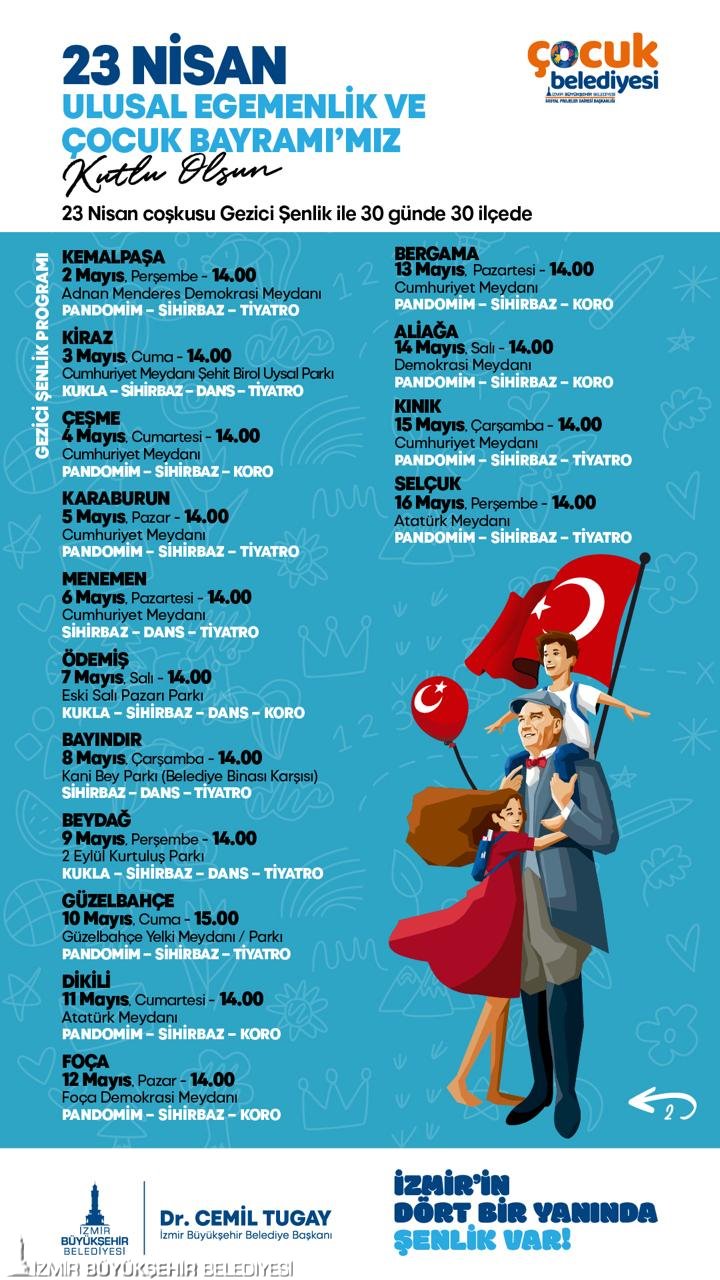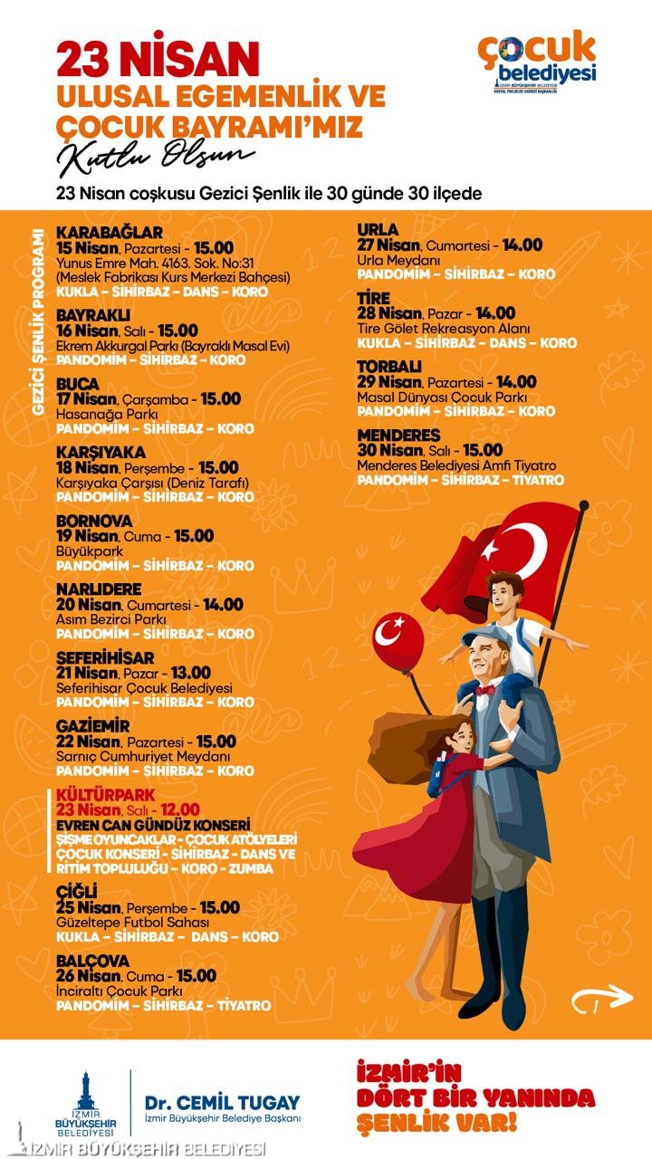 İzmir Büyükşehir Belediyesi, 23 Nisan Ulusal Egemenlik ve Çocuk Bayramı’nı kentin dört bir yanında düzenleyeceği etkinliklerle kutlayacak. “İzmir’in Dört Bir Yanında Şenlik Var” temasıyla 30 gün boyunca 30 ilçede düzenlenecek “Gezici Çocuk Şenlikleri” ile çocuklar pandomin, sihirbaz gösterileri, konserler, dans ve tiyatro gösterileriyle bayramın tadını doyasıya çıkaracak. 23 Nisan'da ise binlerce çocuk Kültürpark’ta düzenlenecek Çoçuk Şenliği’nde bayramın tadını doyasıya yaşayacak. İzmir Büyükşehir Belediyesi’ne bağlı toplu taşıma hizmetleri (İZDENİZ, İZULAŞ, METRO, ESHOT, İZTAŞIT, TRAMVAY) 23 Nisan Salı günü ücretsiz hizmet verecek. İzmir Doğal Yaşam Parkı ise 6-18 yaş arasındaki ziyaretçilerini 22-28 Nisan tarihlerinde ücretsiz olarak ağırlayacak.