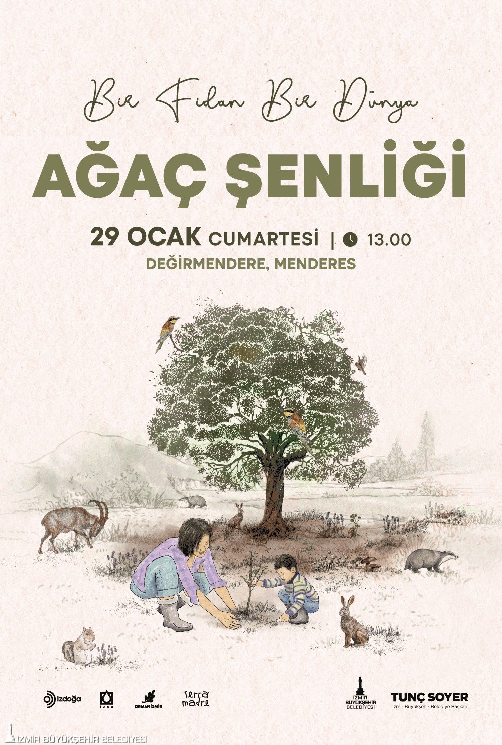 İzmir Büyükşehir Belediye Başkanı Tunç Soyer’in katılımıyla yapılacak ağaç şenliğinde, bağış yapan ve katılım formunu dolduran herkes kendi fidanını dikebilecek. İzmir Büyükşehir Belediyesi Park ve Bahçeler Dairesi Başkanlığı, Fen İşleri Dairesi Başkanlığı, Tarımsal Hizmetler Dairesi Başkanlığı, Sosyal Projeler Dairesi Başkanlığı, İzDoğa ve İZSU’nun birlikte düzenlediği şenlikte fidan dikimiyle beraber pek çok etkinlik yapılacak. Program kapsamında Çöpüne Sahip Çık Vakfı ritim ve heykel atölyesi, Seferihisar Doğa Okulu rehberliğinde kuş gözlem ve meşe palamudu dikim etkinliği, Can Yücel Tohum Merkezi tohum topu atölyesi, Ege Orman Vakfı bez çanta atölyesi, Fungİstanbul müzik dinletisi, Sokak Sanatları Atölyesi’nden canlı performanslar, Hayali Balaban’dan gölge oyunu, Serhat Budak ve Raziye İçtepe’den masal anlatımı var.