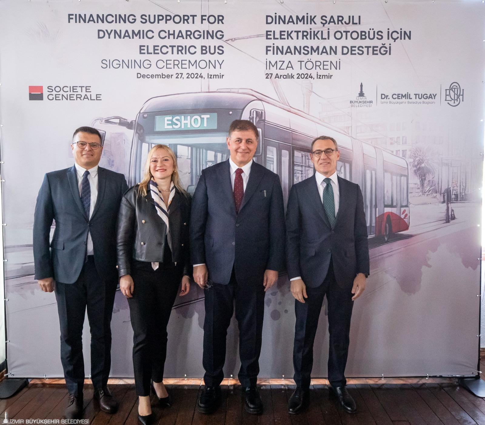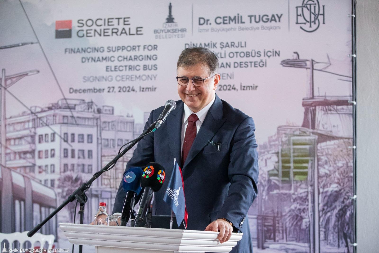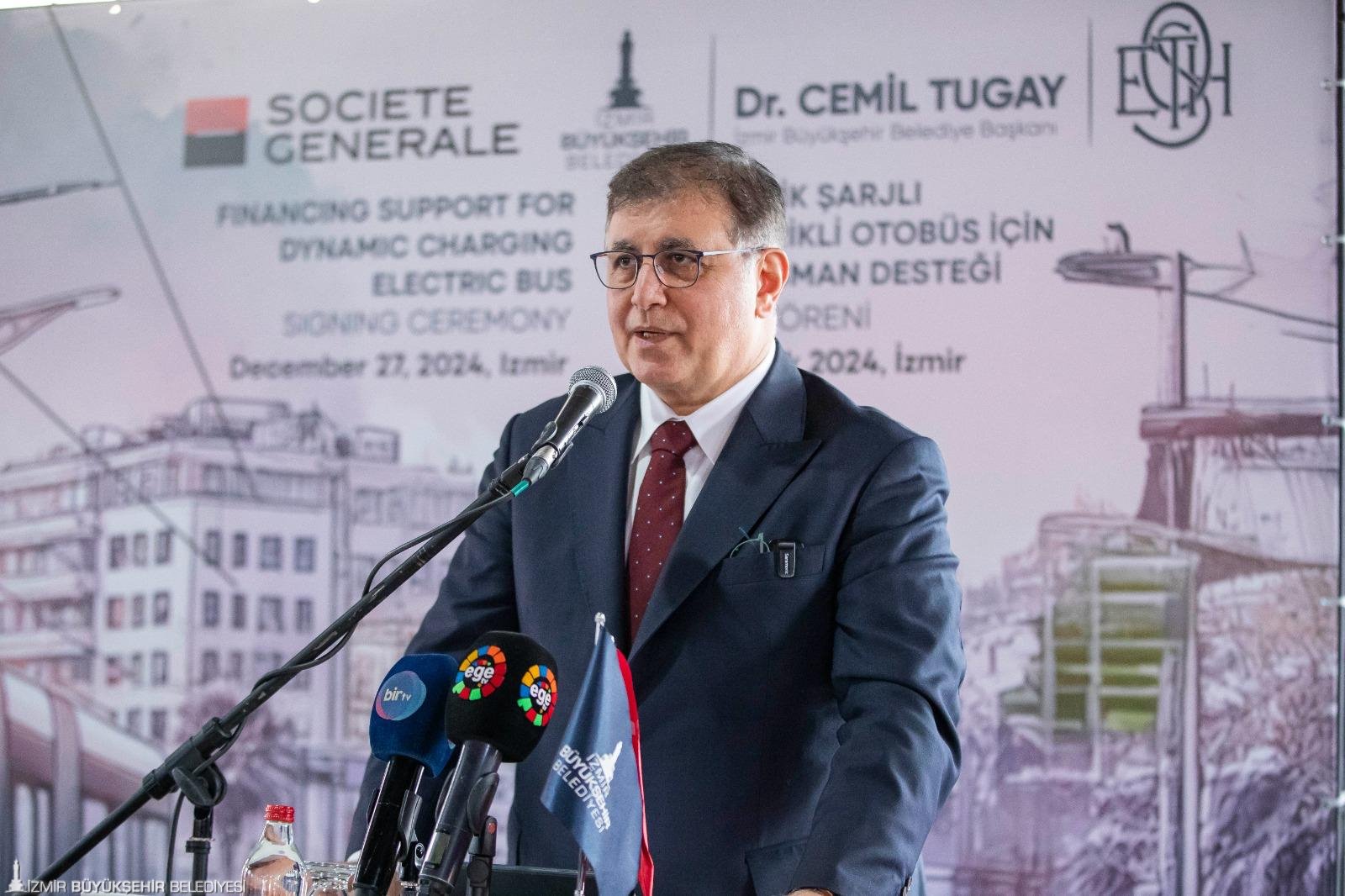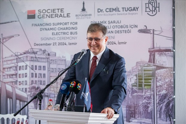 İzmir Büyükşehir Belediyesi ESHOT Genel Müdürlüğü, çevre dostu ve sürdürülebilir ulaşım hedefleri doğrultusunda, filosunu, dinamik şarjlı elektrikli otobüslerle güçlendirecek. Yatırımın finansmanı için Fransız Societe Generale Bank’tan 80 milyon Euro’ya kadar kredi kullanılabilecek. İzmir Büyükşehir Belediye Başkanı Dr. Cemil Tugay ile Fransız Societe Generale Bank Türkiye Müdürü Batu Çetin, kredi ön protokolünün imzalarını, Alsancak Tarihi Havagazı Fabrikası Kültür Merkezi’nde düzenlenen törenle attı. Törene; İzmir Büyükşehir Belediye Başkanı Dr. Cemil Tugay, Fransız Societe Generale Bankası Ülke Müdürü Batu Çetin, Societe Generale Bankası Genel Müdürü Deniz Aydos, ESHOT Genel Müdürü Övünç Özgen ve bürokratlar katılım sağladı. İzmir Büyükşehir Belediye Başkanı Dr. Cemil Tugay, “Bugün burada attığımız bu adım, İzmir’in geleceğini daha yaşanabilir hale getirecek çalışmalardan sadece biridir. Hep birlikte İzmir’i daha güzel bir geleceğe taşıyacağız’’ dedi.