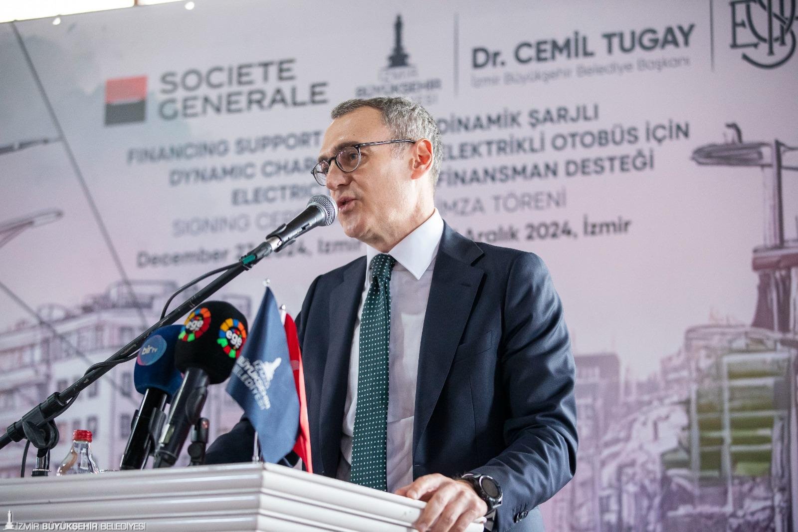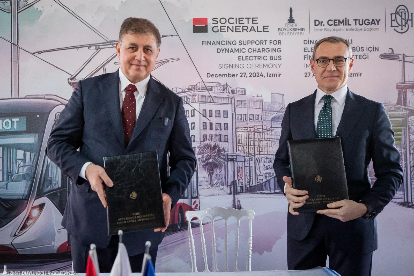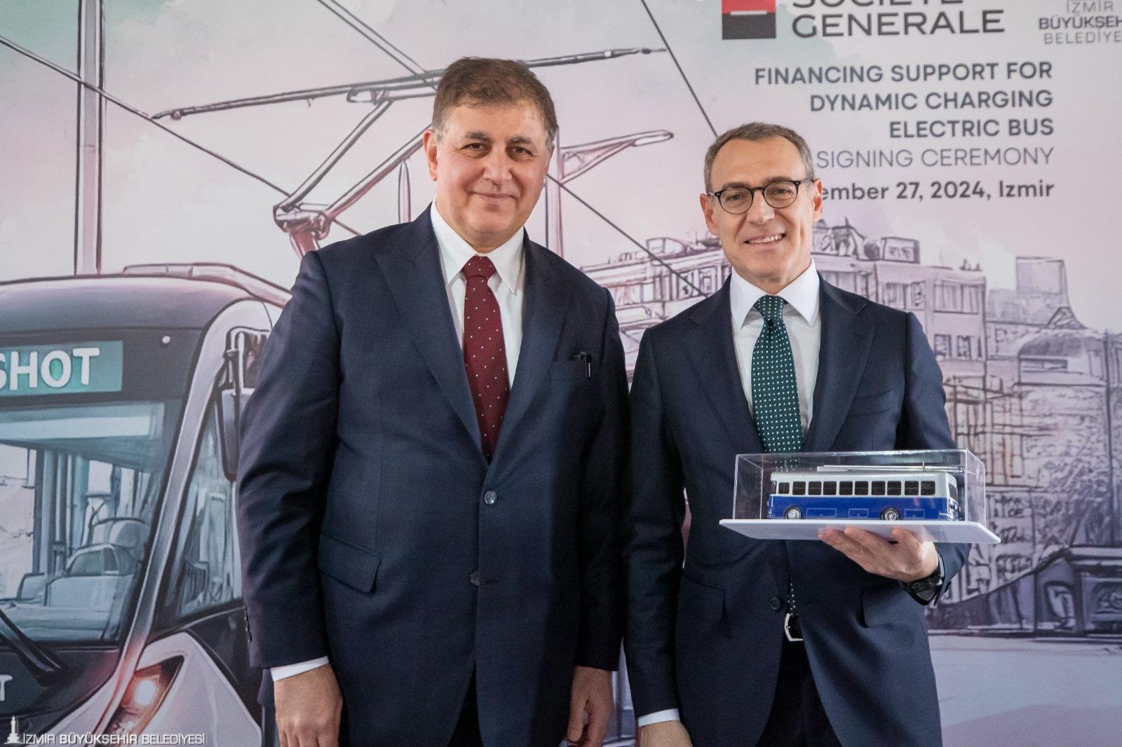 İzmir Büyükşehir Belediyesi ESHOT Genel Müdürlüğü, çevre dostu ve sürdürülebilir ulaşım hedefleri doğrultusunda, filosunu, dinamik şarjlı elektrikli otobüslerle güçlendirecek. Yatırımın finansmanı için Fransız Societe Generale Bank’tan 80 milyon Euro’ya kadar kredi kullanılabilecek. İzmir Büyükşehir Belediye Başkanı Dr. Cemil Tugay ile Fransız Societe Generale Bank Türkiye Müdürü Batu Çetin, kredi ön protokolünün imzalarını, Alsancak Tarihi Havagazı Fabrikası Kültür Merkezi’nde düzenlenen törenle attı. Törene; İzmir Büyükşehir Belediye Başkanı Dr. Cemil Tugay, Fransız Societe Generale Bankası Ülke Müdürü Batu Çetin, Societe Generale Bankası Genel Müdürü Deniz Aydos, ESHOT Genel Müdürü Övünç Özgen ve bürokratlar katılım sağladı. İzmir Büyükşehir Belediye Başkanı Dr. Cemil Tugay, “Bugün burada attığımız bu adım, İzmir’in geleceğini daha yaşanabilir hale getirecek çalışmalardan sadece biridir. Hep birlikte İzmir’i daha güzel bir geleceğe taşıyacağız’’ dedi.