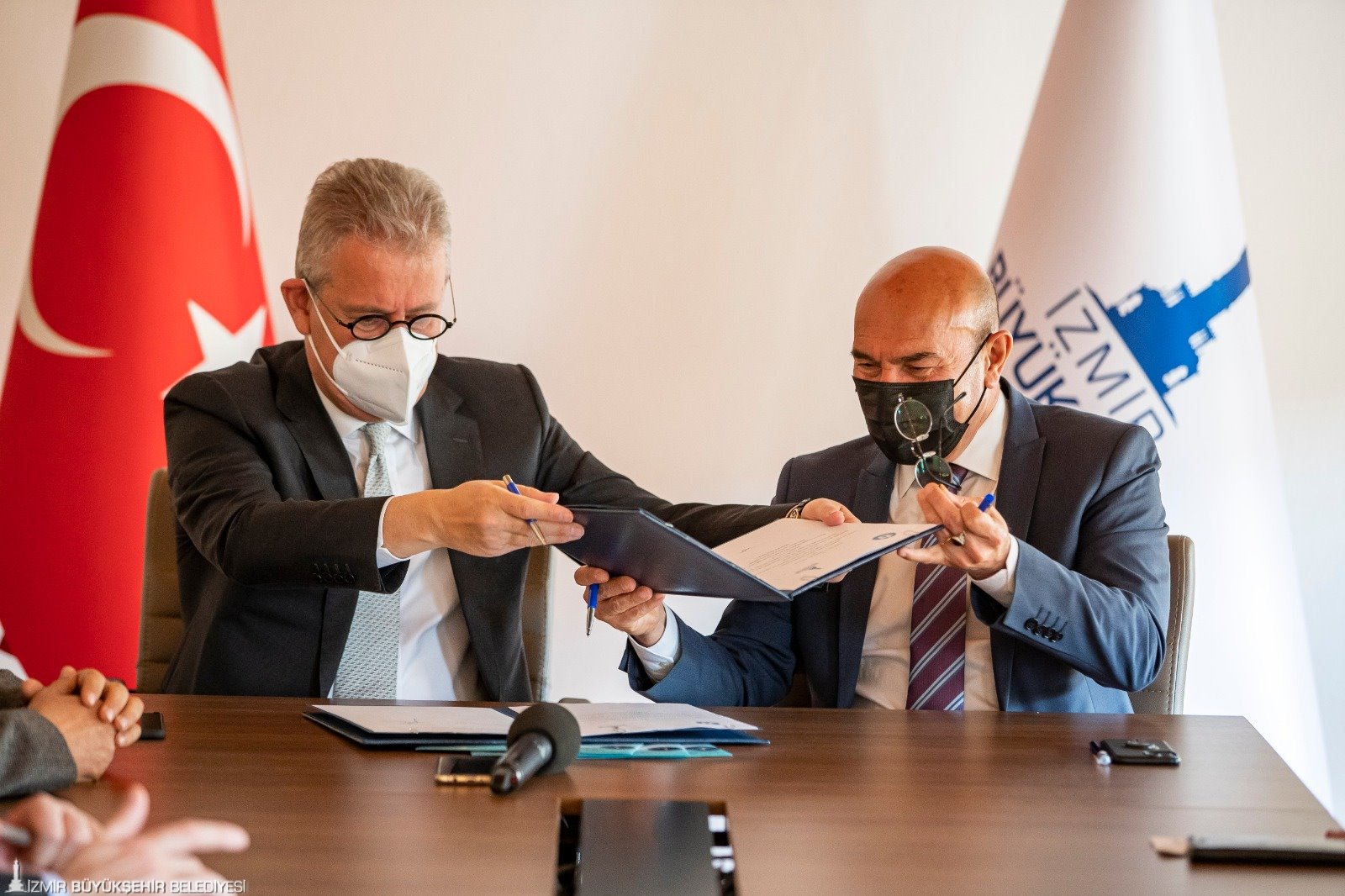 İzmir Büyükşehir Belediyesi Başkanlık makamındaki imza törenine Başkan Tunç Soyer, İzmir Ticaret Odası Başkanı Mahmut Özgener, İzmir Ticaret Odası Kitap, Kırtasiye, Büro Makineleri ve Oyuncak Grubu Komitesi Meclis Üyesi Erdal Tütüncüoğlu, İzmir Büyükşehir Belediyesi Genel Sekreteri Dr. Buğra Gökçe katıldı.