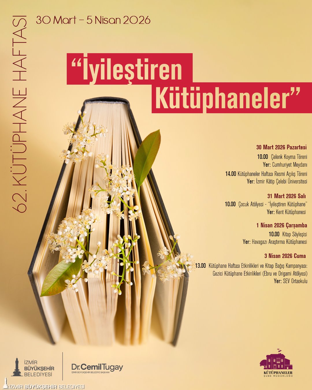 62. Kütüphane Haftası, İzmir Büyükşehir Belediyesi tarafından bu yıl “İyileştiren Kütüphane” temasıyla 30 Mart-5 Nisan tarihleri arasında kutlanıyor. Hafta kapsamında 1 Nisan Çarşamba 14.00-16.00 saatleri arasında “Dijital Kültürel Miras ve Açık Erişim: Kütüphanelerin ve Kent Arşivlerinin Rolü” başlıklı panel düzenlenecek.
