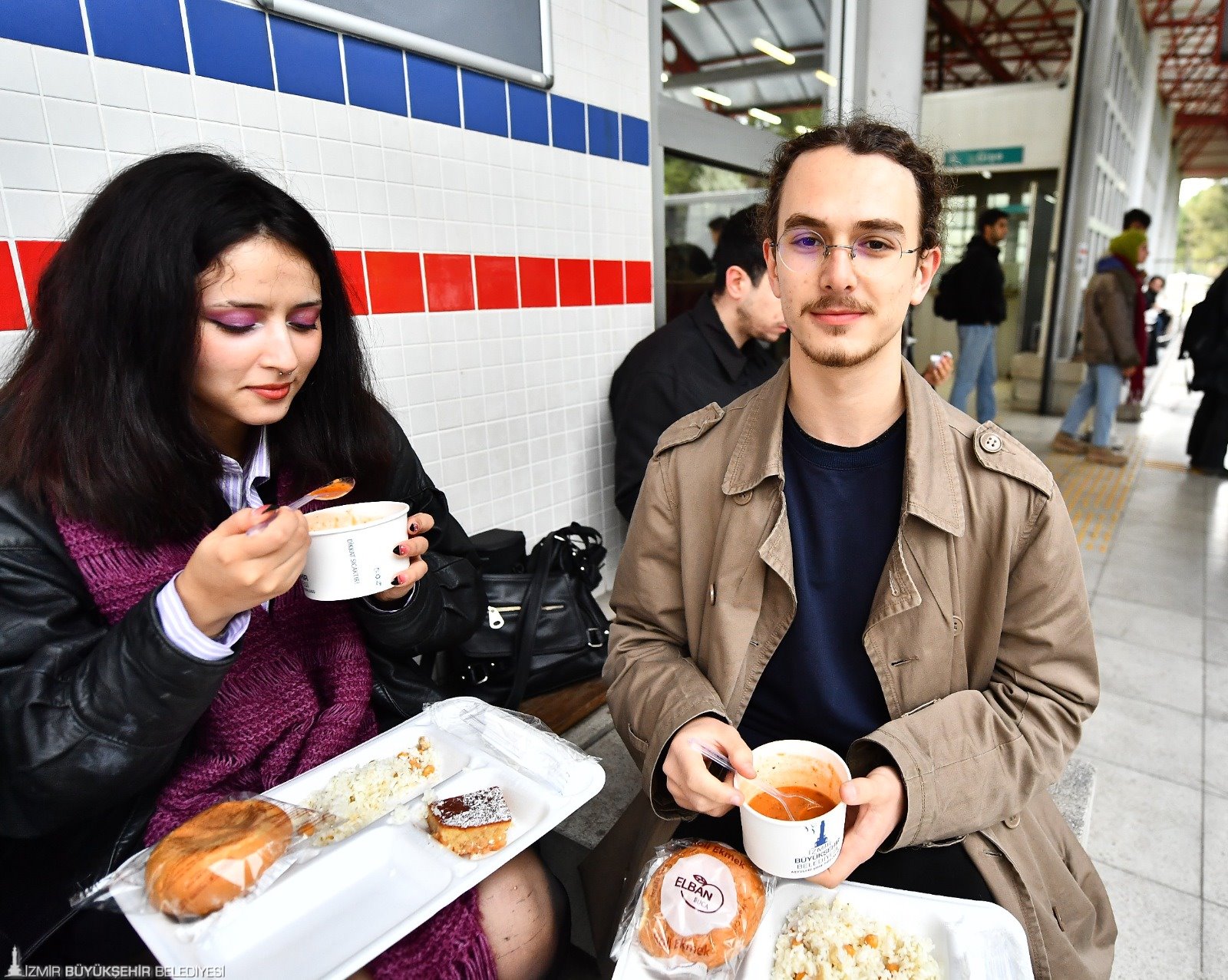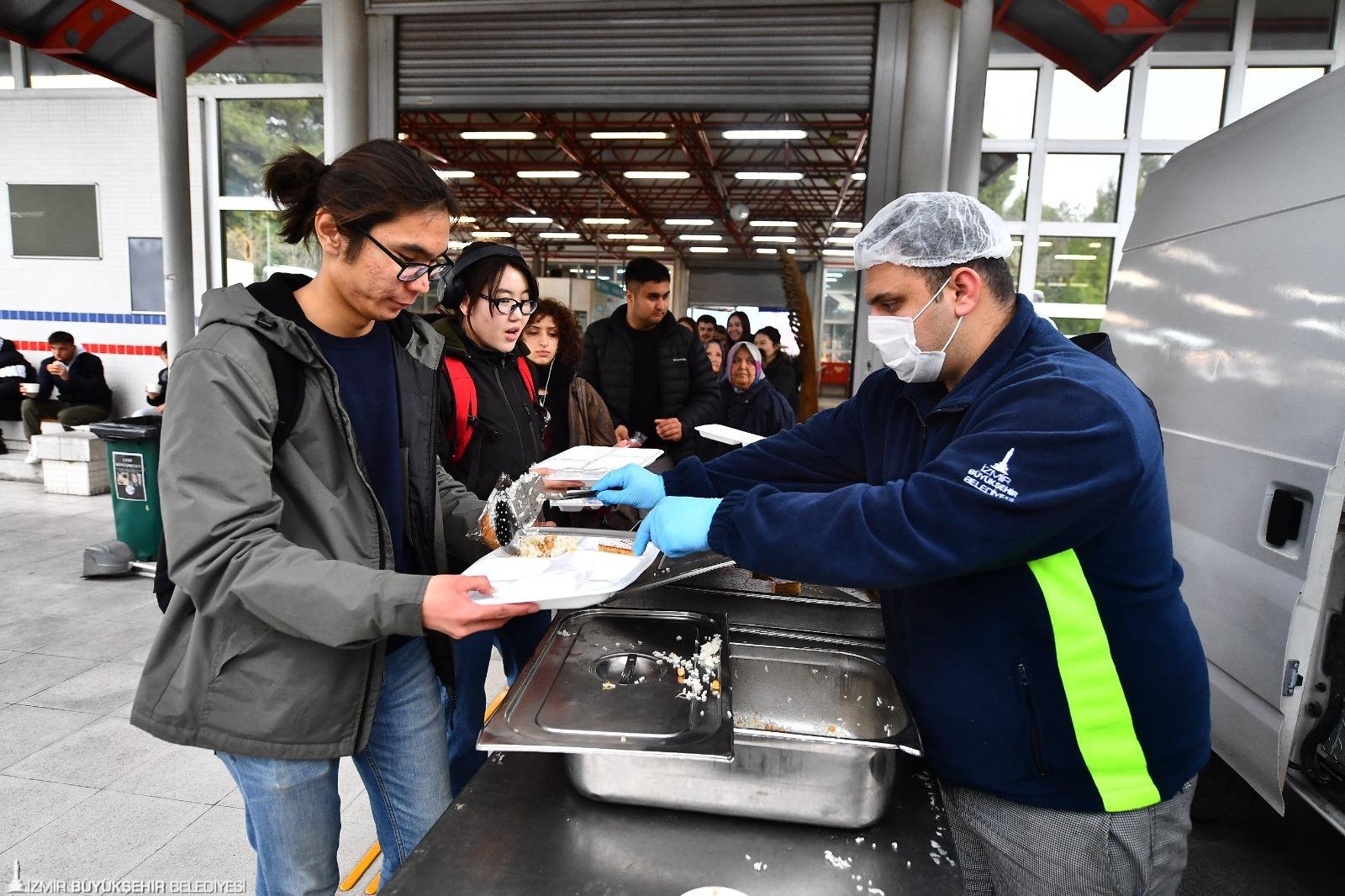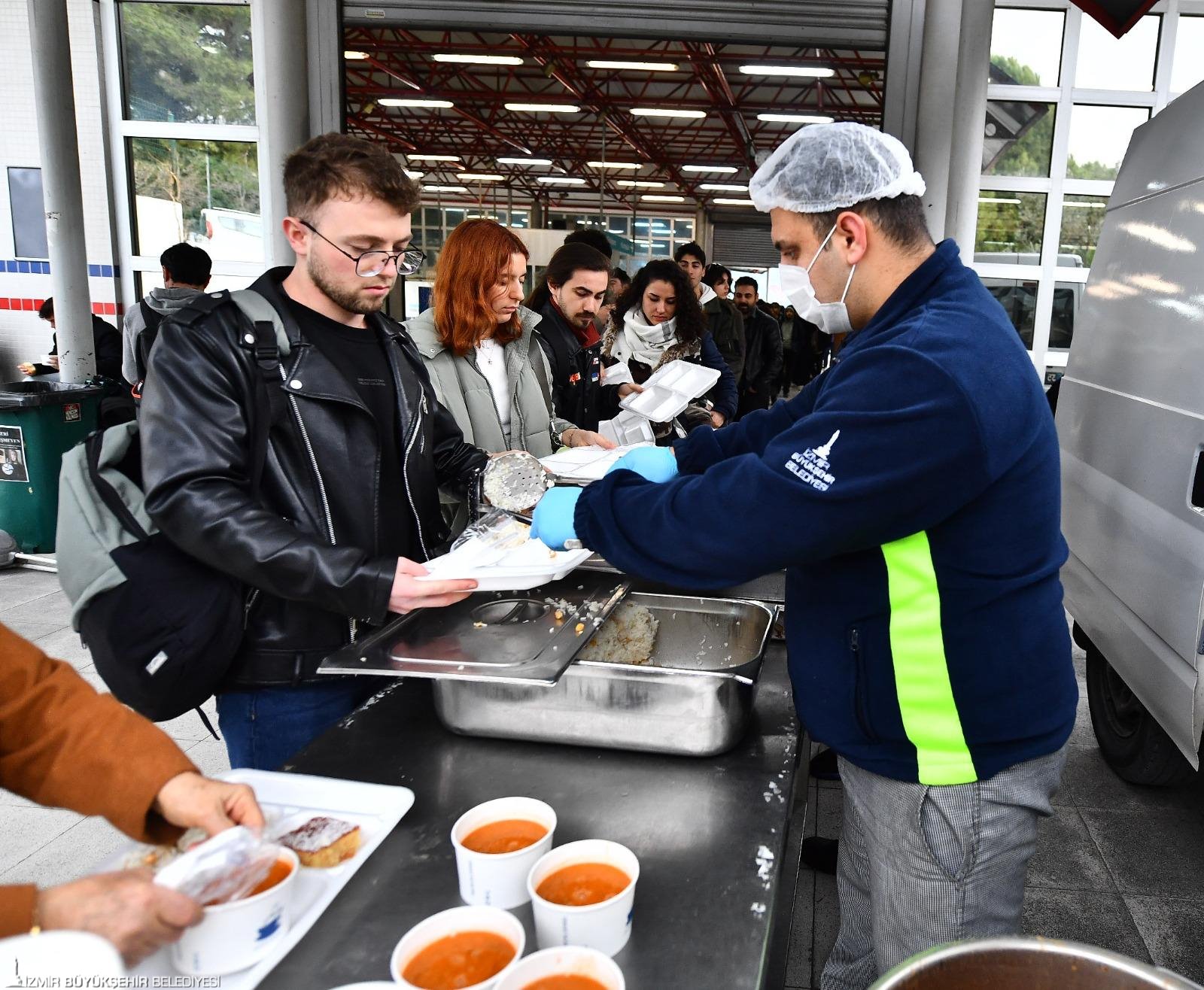 İzmir Büyükşehir Belediyesi’nin üniversite öğrencilerine sunduğu ücretsiz sıcak yemek uygulaması devam ediyor. Büyükşehir Belediyesi bünyesindeki aşevinde üretilen sağlıklı ve lezzetli yemekler, Ege Üniversitesi içi metro durağı, Katip Çelebi Üniversite içi kız yurdu yakını, Bakırçay Üniversitesi içi, Demokrasi Üniversitesi önü, İzmir Yüksek Teknoloji Enstitüsü (İ.Y.T.E.) içi kütüphane önü, Dokuz Eylül Üniversitesi Tarık Akan Gençlik Merkezi önünde bulunan 6 noktadan üniversite öğrencilerine ulaştırılıyor.