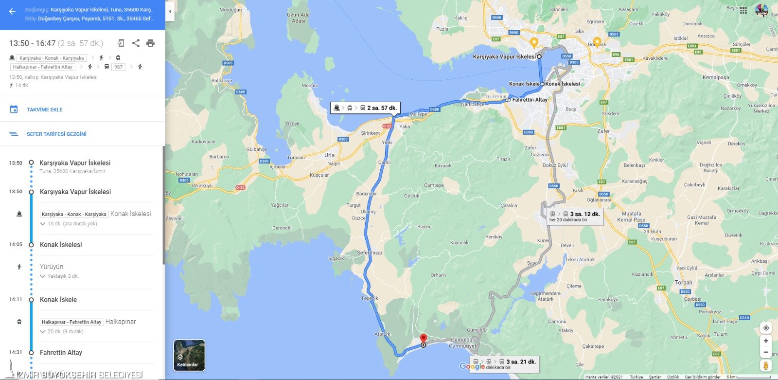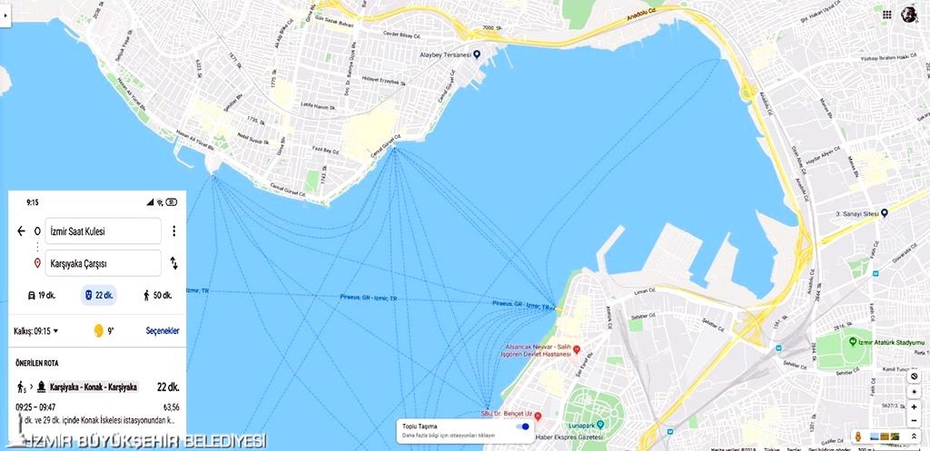 İzmir’de örneğin Karşıyaka’dan Adnan Menderes Havalimanı’na gitmek isteyen bir kişi, Google Haritalar’da toplu ulaşım seçeneğini seçtikten sonra Karşıyaka İskelesi’nin üzerine tıklayacak. Sefer saatlerini ve güzergâh bilgilerini gösteren ekran açılacak. Aynı hedefe otomobille yaklaşık bir buçuk saatte, vapur ve raylı sistem aktarmasıyla 50 dakikada gidilebildiğini gösteren veriler ekrana yansıyacak.